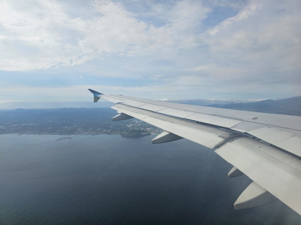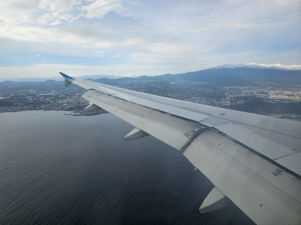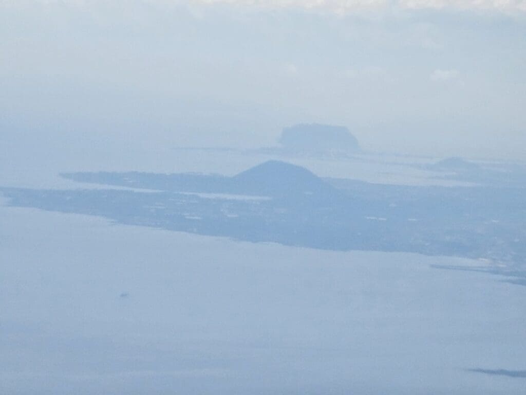 Around halfway into our sea crossing, the thick clouds dissipated below and the blue waters came into view. A few moments later, the very small island of Yeoseo appeared. Covering an area of 2.51 square kilometres (0.97 square miles), as per the 2009 census, this was home to 93 residents. Continuing onwards, the Airbus made its way to the seas of Jeju’s northeastern coastline before turning back towards the island. Thanks to the clear weather around Jeju, it wasn’t long before I spotted the sight of Jeju’s eastern coastline, with both U Island and the popular volcano, Seongsan Ilchulbong welcoming us to Jeju followed by the luscious greens and volcanic greys of the northern coastline.