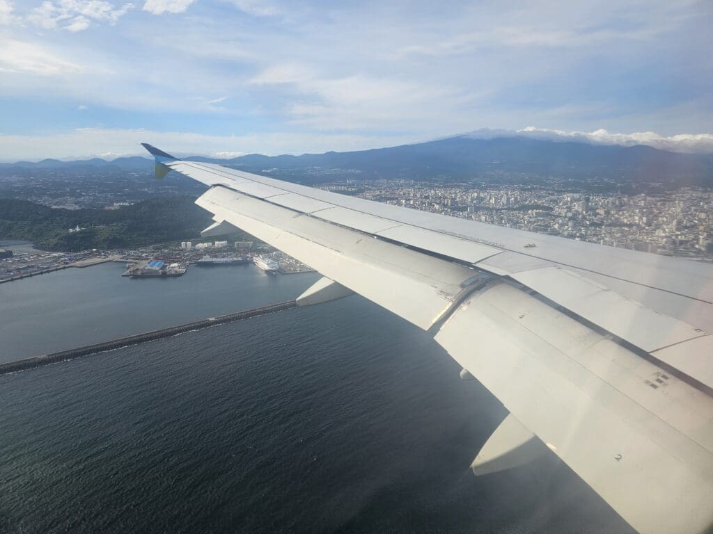 After just seven minutes at 20,000 feet, the Airbus could be felt commencing its descent as we crossed over Korea’s sixth-largest city, Gwangju. As we left the city behind, the Purser performed their pre-arrival announcement in Korean and English with all the usual warnings before the cabin crew took to the aisle and began ensuring that all was in place for our arrival. Soon, the aircraft left the Korean Peninsula behind and made its way over the short stretch of sea that separates the mainland from Jeju.