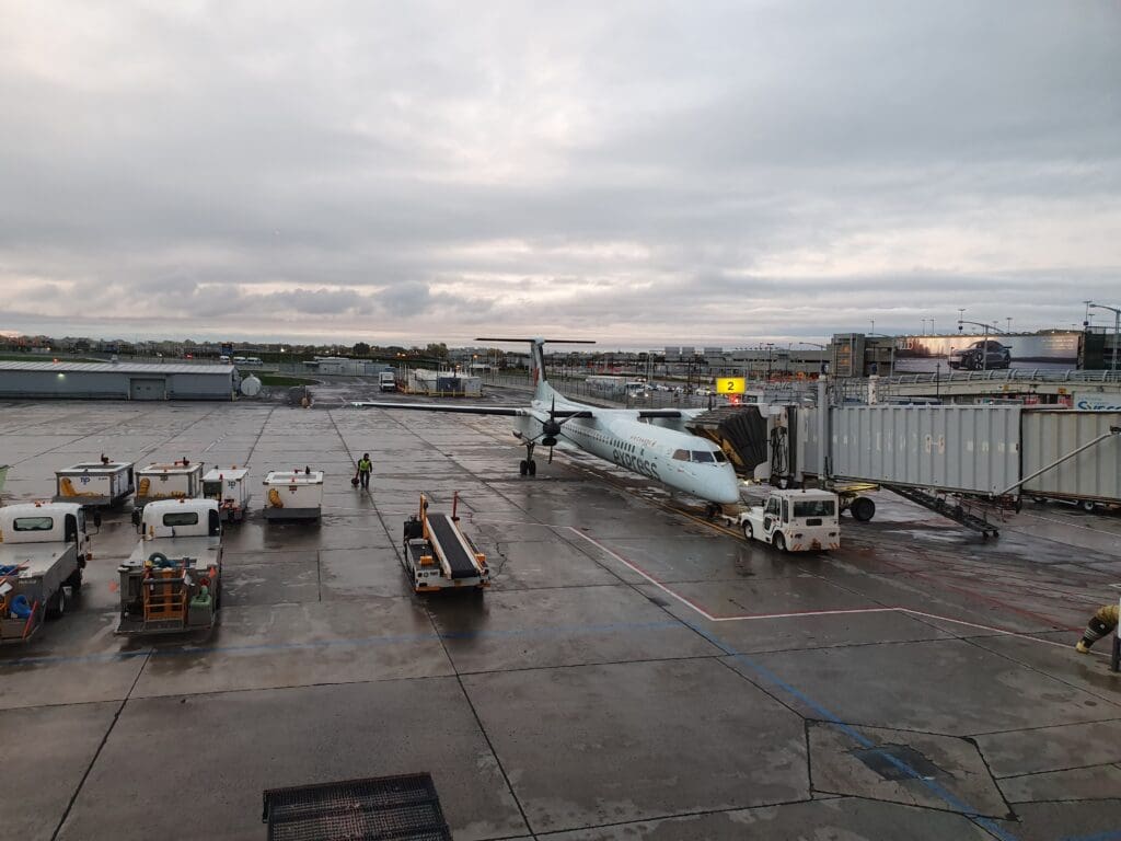 No more than a couple of minutes after touching down, the Dash 8 made its way into Stand 25 where it parked up alongside a newer and larger Air Canada Express Dash 8 Q400 that had also recently arrived from Montréal. After coming to a halt, the engines spooled down, temporarily filling the cabin with vibrations before the cabin was plunged into silence and the flight attendant opened the cabin door. Much to my surprise, I was the only passenger to disembark in Québec City and after thanking the flight attendant I made my way down the aircraft’s built-in steps and was promptly welcomed by a ground agent who pointed me in the direction of the terminal.