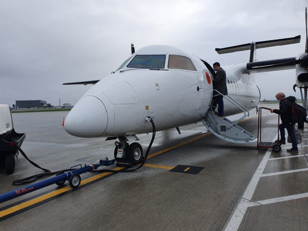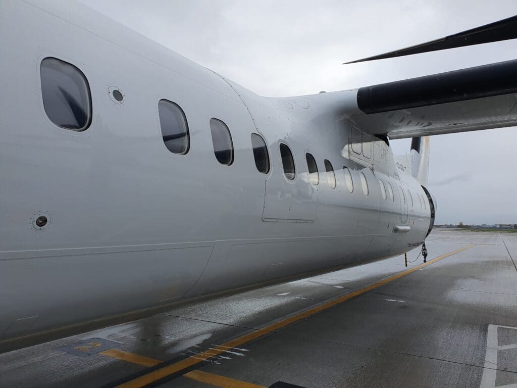 Given the low cruising altitude, it did not take long for the Dash 8 to level off at which point the seatbelt signs were switched off. At this point, the flight attendant made an announcement with the usual warning regarding keeping seatbelts fastened when seated and advised passengers that the inflight service would commence shortly. Having drawn the curtain at the front of the aircraft so as not to reveal what the inflight service would consist of that morning, a few minutes later the flight attendant emerged holding a two-litre bottle of water and a stack of Styrofoam cups. Having believed this to have been the entirety of the service that morning, I was delighted to then see a basket containing cereal bars and packets of chocolate biscuits passing through the cabin – opting for the latter this was handed to me in a polite and friendly manner. Needless to say, I was pleasantly surprised to be offered a complimentary snack on such a short flight during the Covid era! Almost as soon as I had received this, the aircraft hit a particularly rough patch of turbulence and the seat belt signs were switched on, resulting in the aircraft climbing up to 15,000 feet at which point the ride smoothed out and the seat belt signs were extinguished once again.