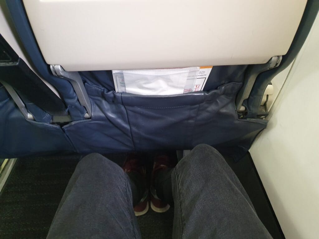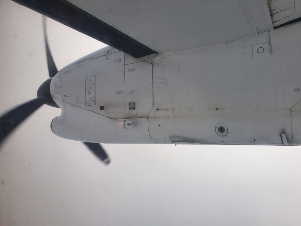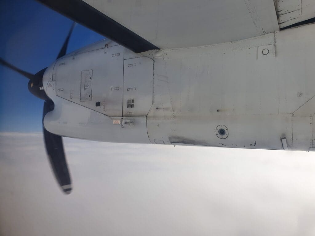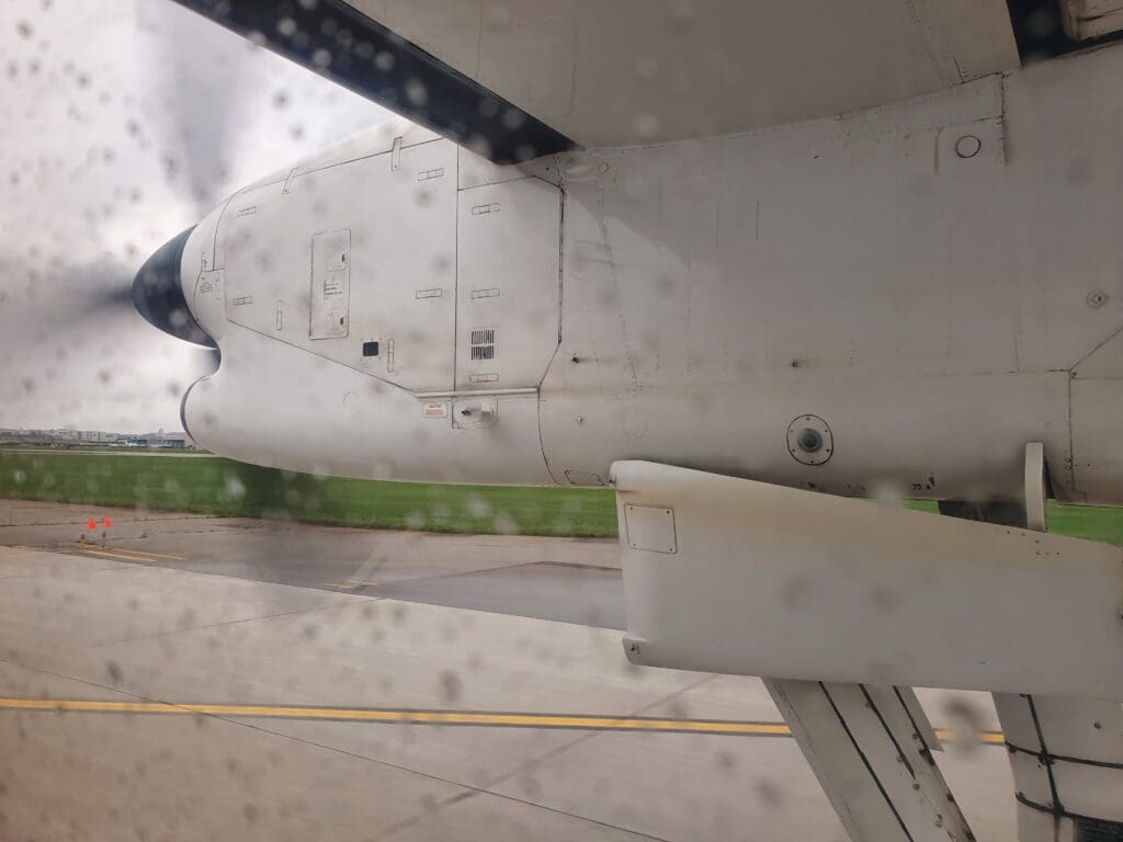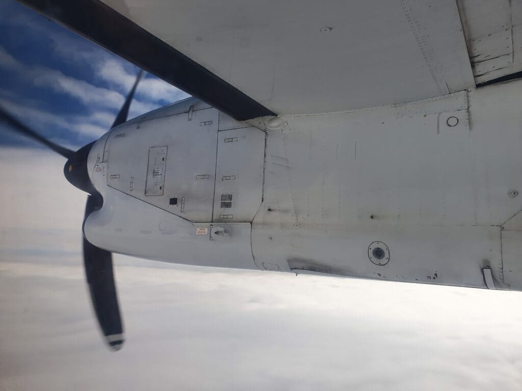 Upon sitting down, whilst the seats were firm, I was pleased and slightly surprised to find that these offered a fantastic amount of legroom. Perhaps unsurprisingly given the aircraft’s age, the cabin did appear to be slightly battered and worn, with a few marks and scratches present, however, it is worth noting that I have travelled on much newer aircraft in a far more tired state. In terms of design, the cabin was dated with old-fashioned PSUs, slightly discoloured panelling and relatively chunky windows. Whilst a fair number of rows appeared to be poorly aligned with the twelve windows on either side of the cabin, I was pleased to find that my seat aligned well with one of the portholes on the starboard side of the turboprop. However, as expected, these provided little view other than of the engine and the apron below. Interestingly, I noted that the aircraft appeared to lack window blinds, although being an enthusiast and enjoying watching the world go by, I am not a major fan of these anyway! Finally, the seatback pocket featured a safety card and a white logoless paper sick bag, located inside a resealable sandwich bag – presumably to allow for greater protection in the event that this was used.