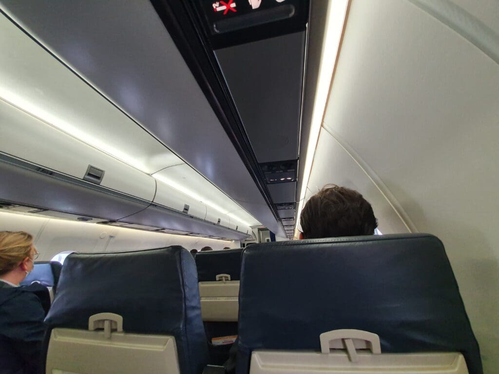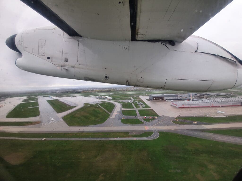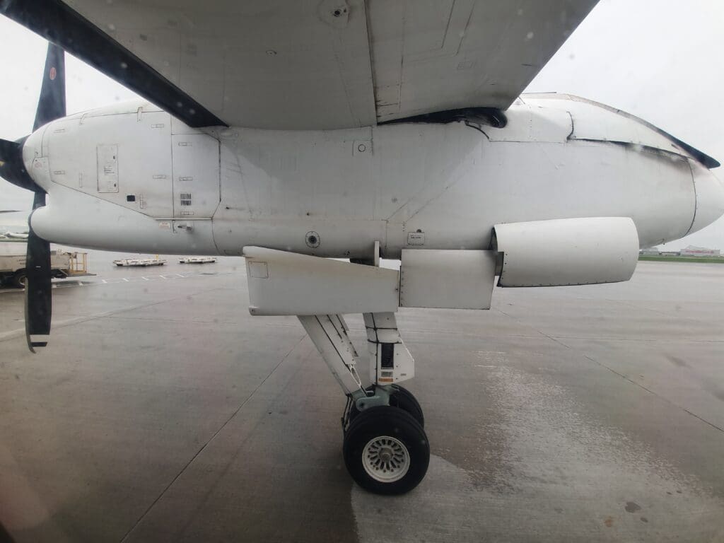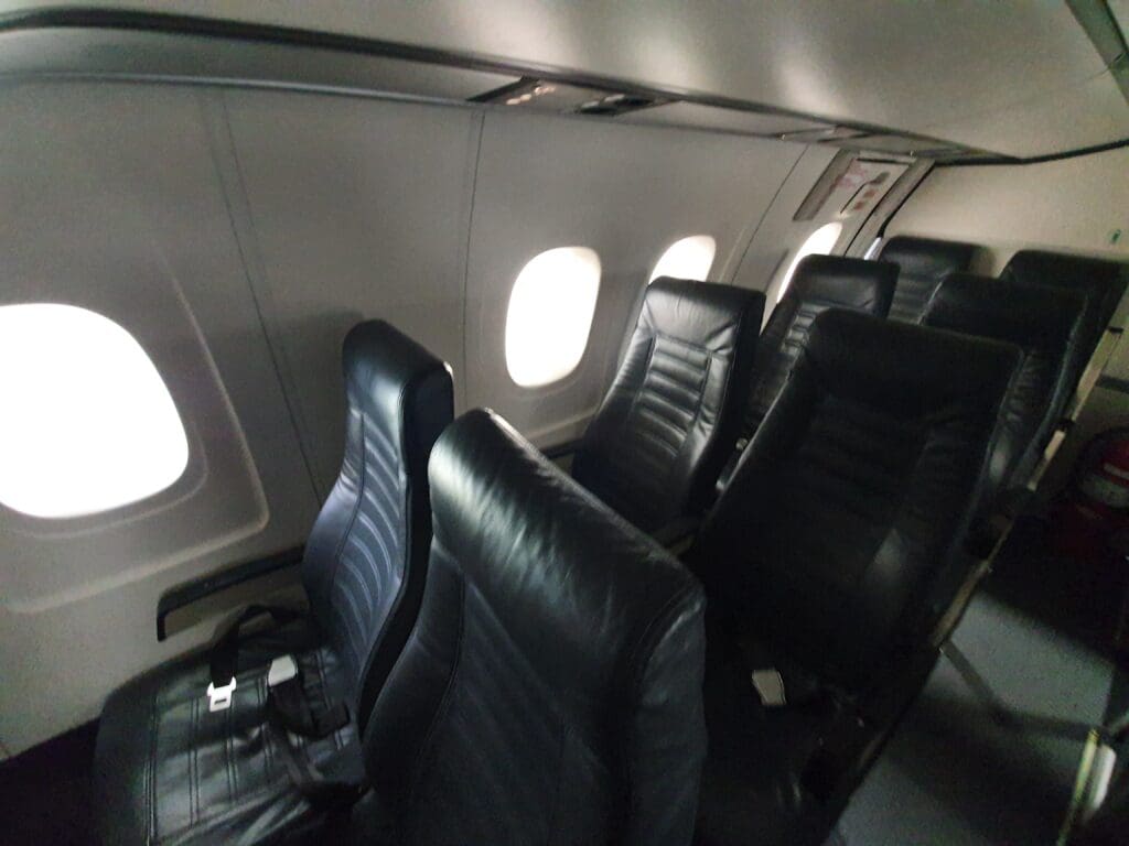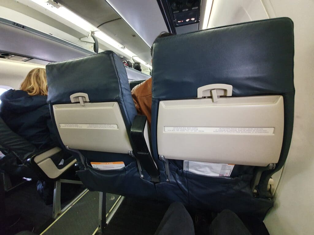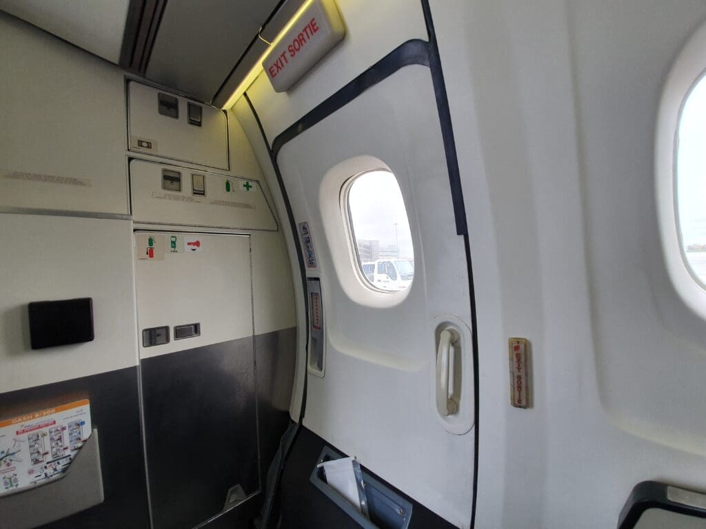 Upon sitting down, whilst the seats were firm, I was pleased and slightly surprised to find that these offered a fantastic amount of legroom. Perhaps unsurprisingly given the aircraft’s age, the cabin did appear to be slightly battered and worn, with a few marks and scratches present, however, it is worth noting that I have travelled on much newer aircraft in a far more tired state. In terms of design, the cabin was dated with old-fashioned PSUs, slightly discoloured panelling and relatively chunky windows. Whilst a fair number of rows appeared to be poorly aligned with the twelve windows on either side of the cabin, I was pleased to find that my seat aligned well with one of the portholes on the starboard side of the turboprop. However, as expected, these provided little view other than of the engine and the apron below. Interestingly, I noted that the aircraft appeared to lack window blinds, although being an enthusiast and enjoying watching the world go by, I am not a major fan of these anyway! Finally, the seatback pocket featured a safety card and a white logoless paper sick bag, located inside a resealable sandwich bag – presumably to allow for greater protection in the event that this was used.