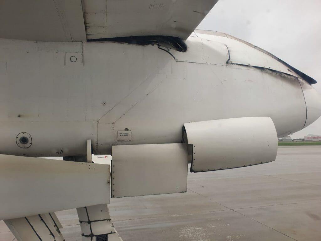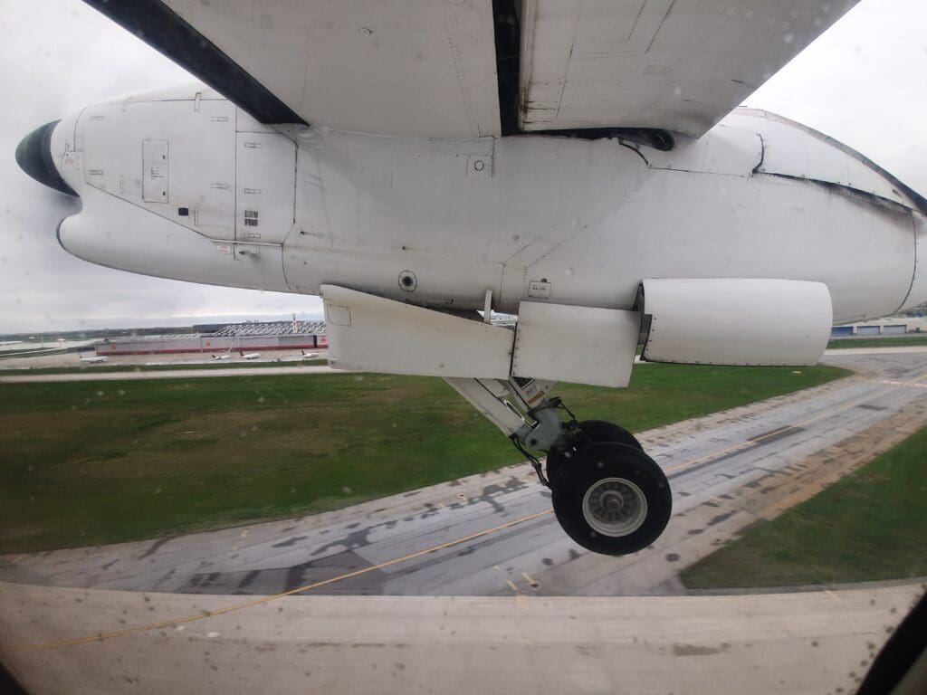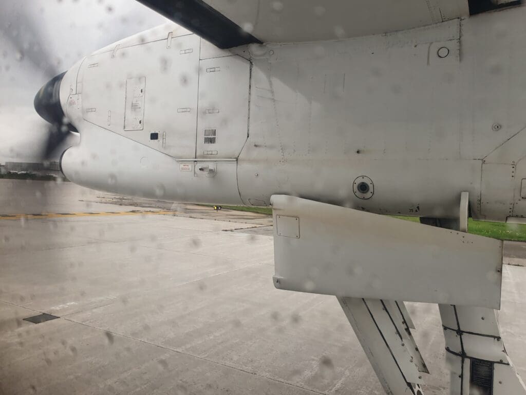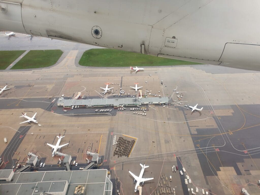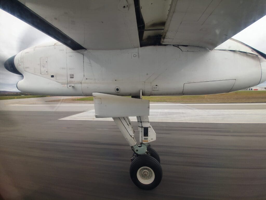 Upon sitting down, whilst the seats were firm, I was pleased and slightly surprised to find that these offered a fantastic amount of legroom. Perhaps unsurprisingly given the aircraft’s age, the cabin did appear to be slightly battered and worn, with a few marks and scratches present, however, it is worth noting that I have travelled on much newer aircraft in a far more tired state. In terms of design, the cabin was dated with old-fashioned PSUs, slightly discoloured panelling and relatively chunky windows. Whilst a fair number of rows appeared to be poorly aligned with the twelve windows on either side of the cabin, I was pleased to find that my seat aligned well with one of the portholes on the starboard side of the turboprop. However, as expected, these provided little view other than of the engine and the apron below. Interestingly, I noted that the aircraft appeared to lack window blinds, although being an enthusiast and enjoying watching the world go by, I am not a major fan of these anyway! Finally, the seatback pocket featured a safety card and a white logoless paper sick bag, located inside a resealable sandwich bag – presumably to allow for greater protection in the event that this was used.