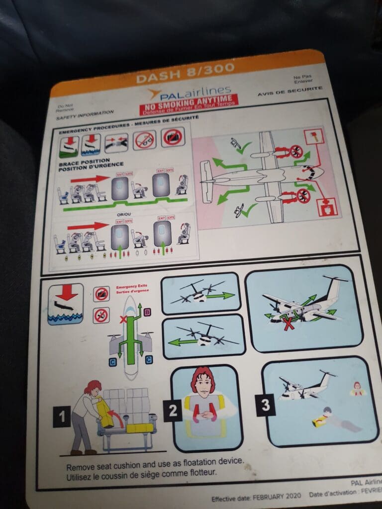 Once seated, I buckled up my Dash 8 branded seatbelt and the cabin lights were soon switched on, at which point a pre-recorded announcement played in French and English regarding the usage of electronic devices. Within a few short minutes, boarding for the flight was complete and at 0949 the flight attendant closed the cabin door. That morning, a total of just 15 passengers were aboard for the first leg of the service and I was pleased to find that the neighbouring seat remained vacant. After the cabin door was closed, the flight attendant performed a brief welcome announcement in French and English, during which they thanked all onboard for choosing to fly with PAL Airlines and informed all of the forty-minute flight time and the cruising altitude of 13,000 feet. Once this speech came to an end, a pre-recorded safety announcement rang out through the cabin which was accompanied by a manual safety demonstration by the flight attendant.