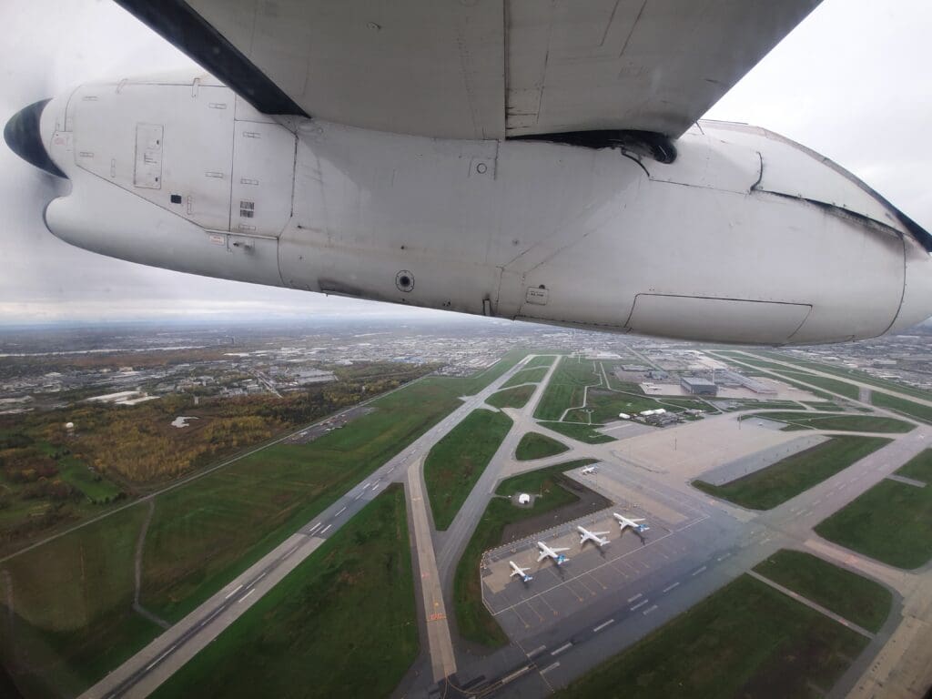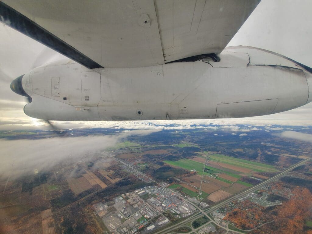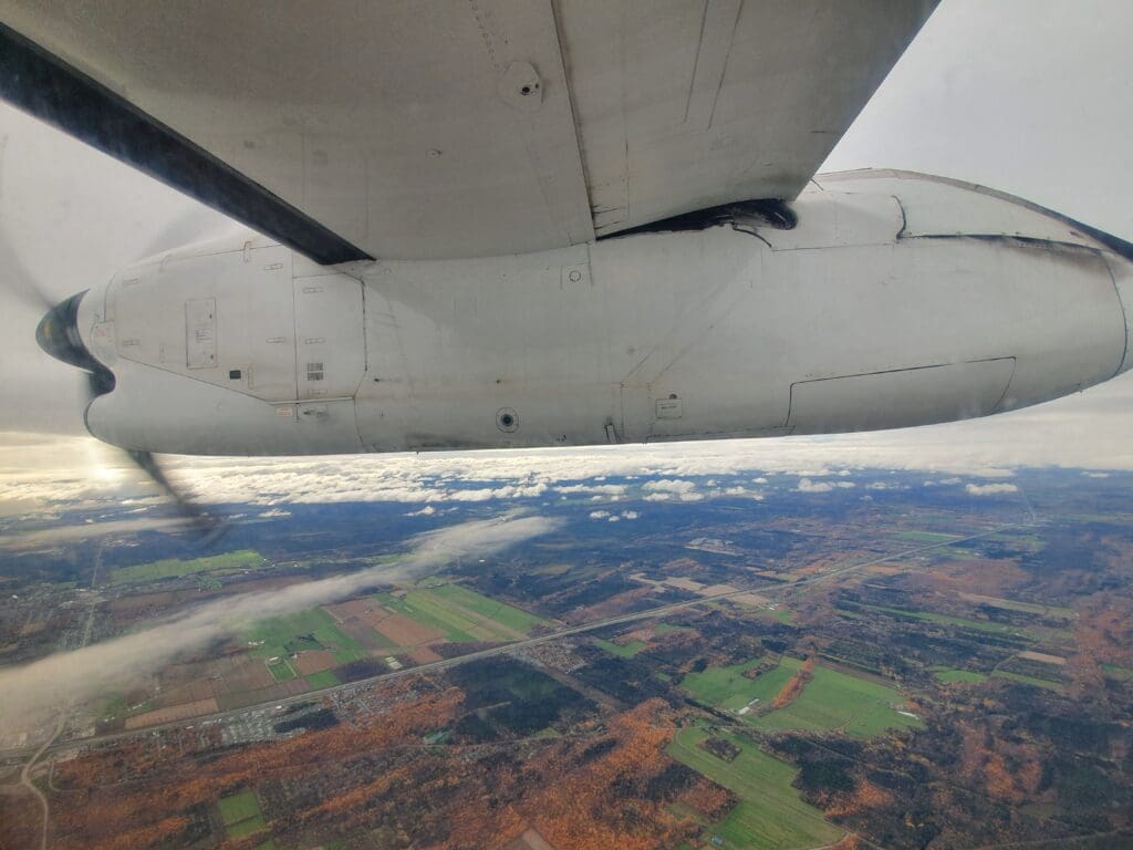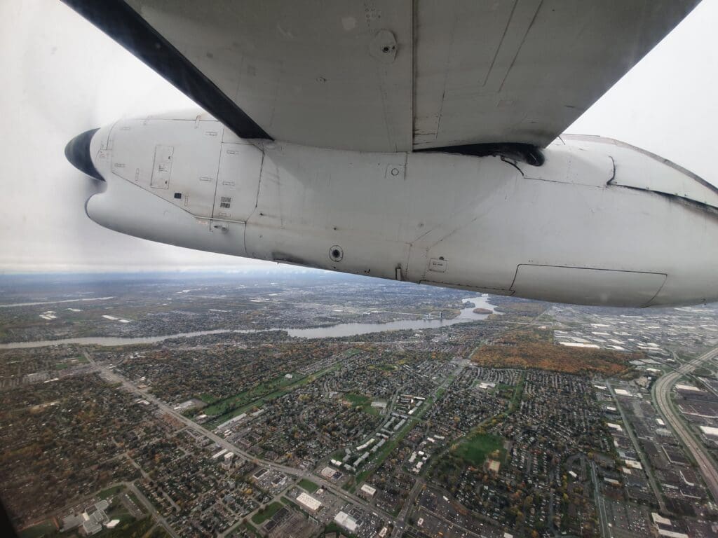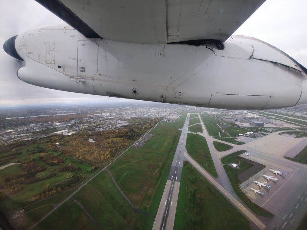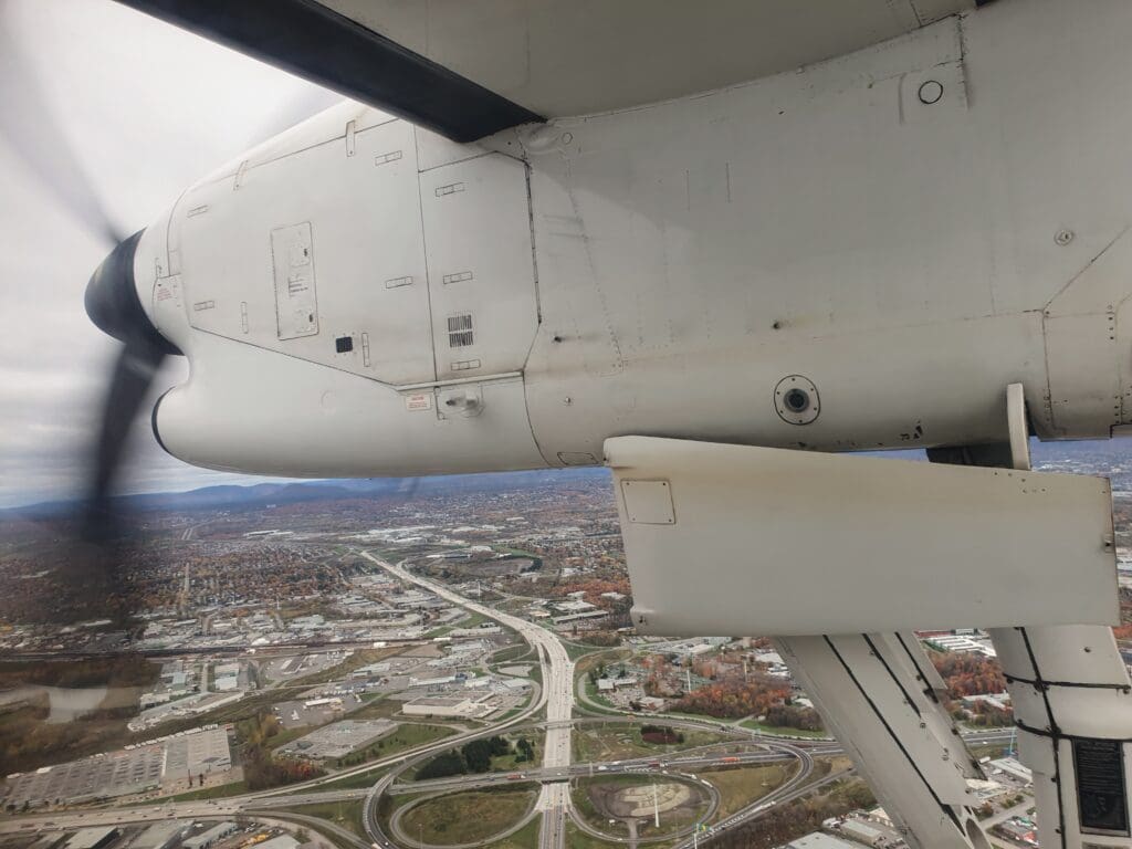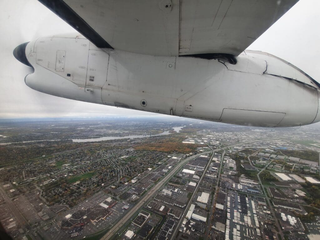 Once an all-black liveried Chrono Aviation Pilatus PC-12 took off bound for the western Québec city of Rouyn-Noranda, inside the cabin two loud dings could be heard as the Dash 8 made its way onto the runway. At 1007, without any pausing the aircraft’s two engines powered up, filling the cabin with plenty of noise and vibration as the aircraft travelled a short way down the runway before quickly taking to the skies. As the Dash 8 soared upwards, I was offered a good overview of almost the entire airport as the aircraft banked right before leaving the airport behind. Within seconds, the sight of the airport below was replaced by the mostly residential neighbourhoods of Saint-Laurent and Roxboro as well as the Prairies River before the aircraft rose up into the low-lying clouds which would prevent any view of the Québec until we neared our destination.