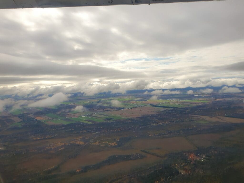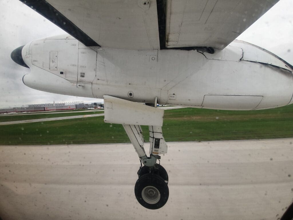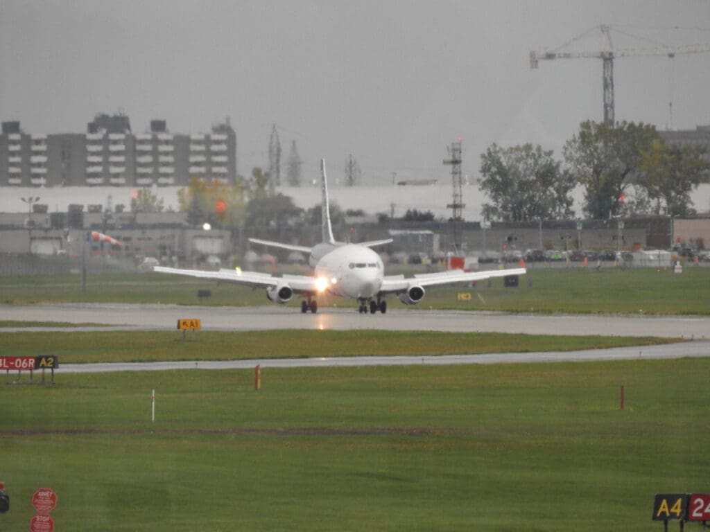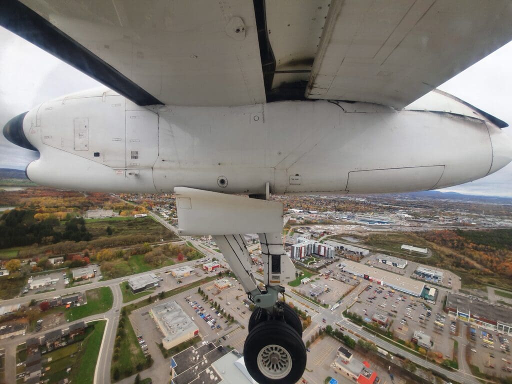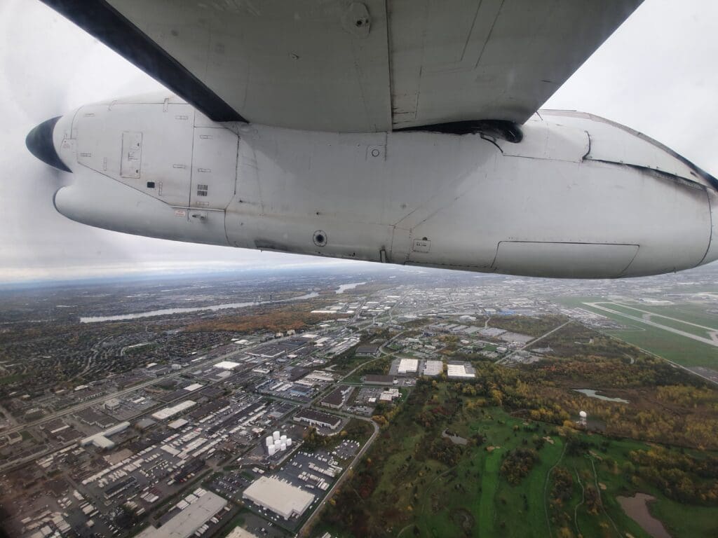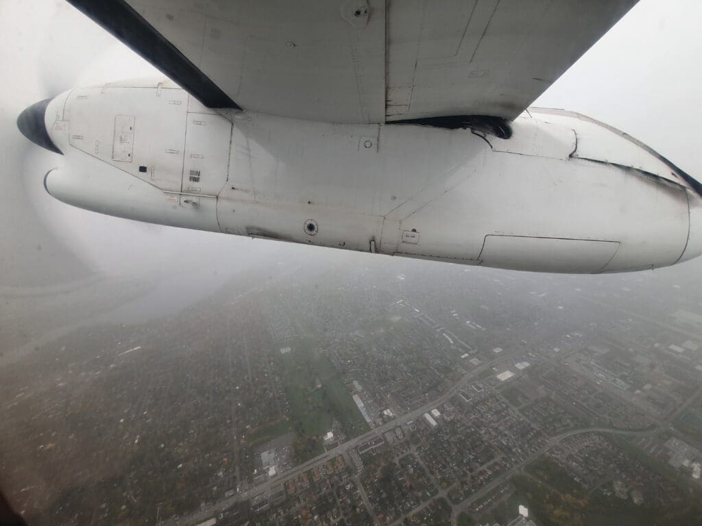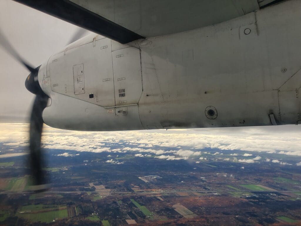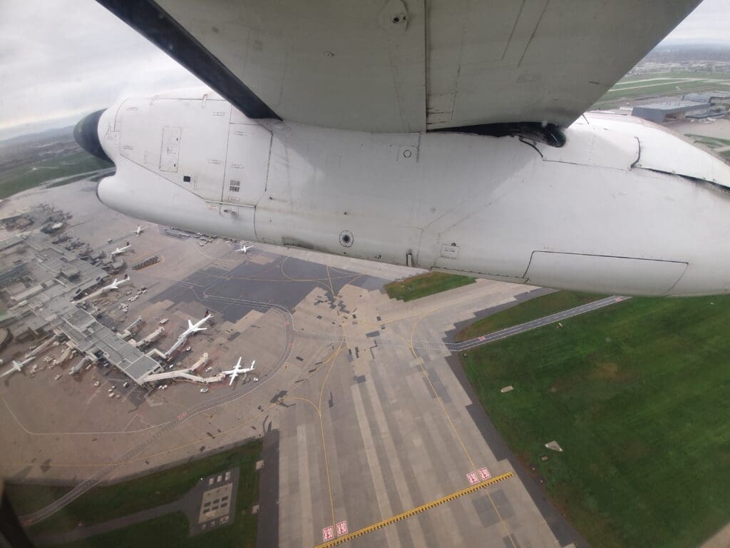 Once an all-black liveried Chrono Aviation Pilatus PC-12 took off bound for the western Québec city of Rouyn-Noranda, inside the cabin two loud dings could be heard as the Dash 8 made its way onto the runway. At 1007, without any pausing the aircraft’s two engines powered up, filling the cabin with plenty of noise and vibration as the aircraft travelled a short way down the runway before quickly taking to the skies. As the Dash 8 soared upwards, I was offered a good overview of almost the entire airport as the aircraft banked right before leaving the airport behind. Within seconds, the sight of the airport below was replaced by the mostly residential neighbourhoods of Saint-Laurent and Roxboro as well as the Prairies River before the aircraft rose up into the low-lying clouds which would prevent any view of the Québec until we neared our destination.