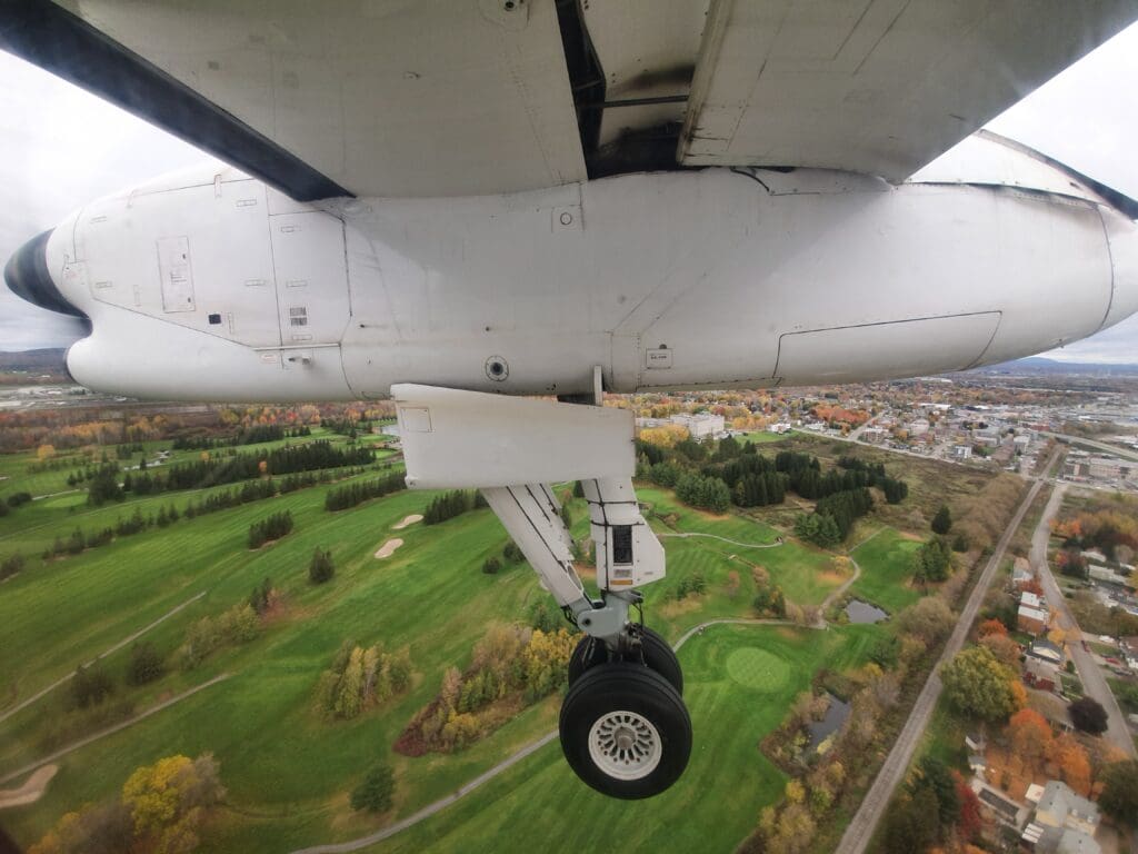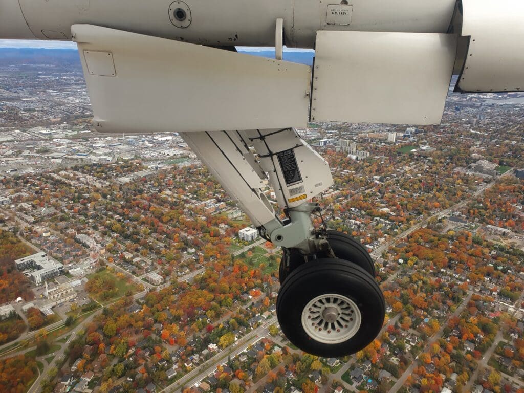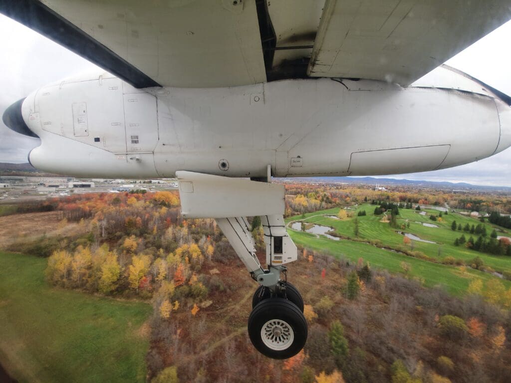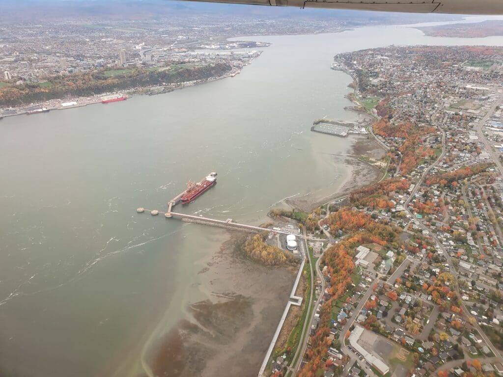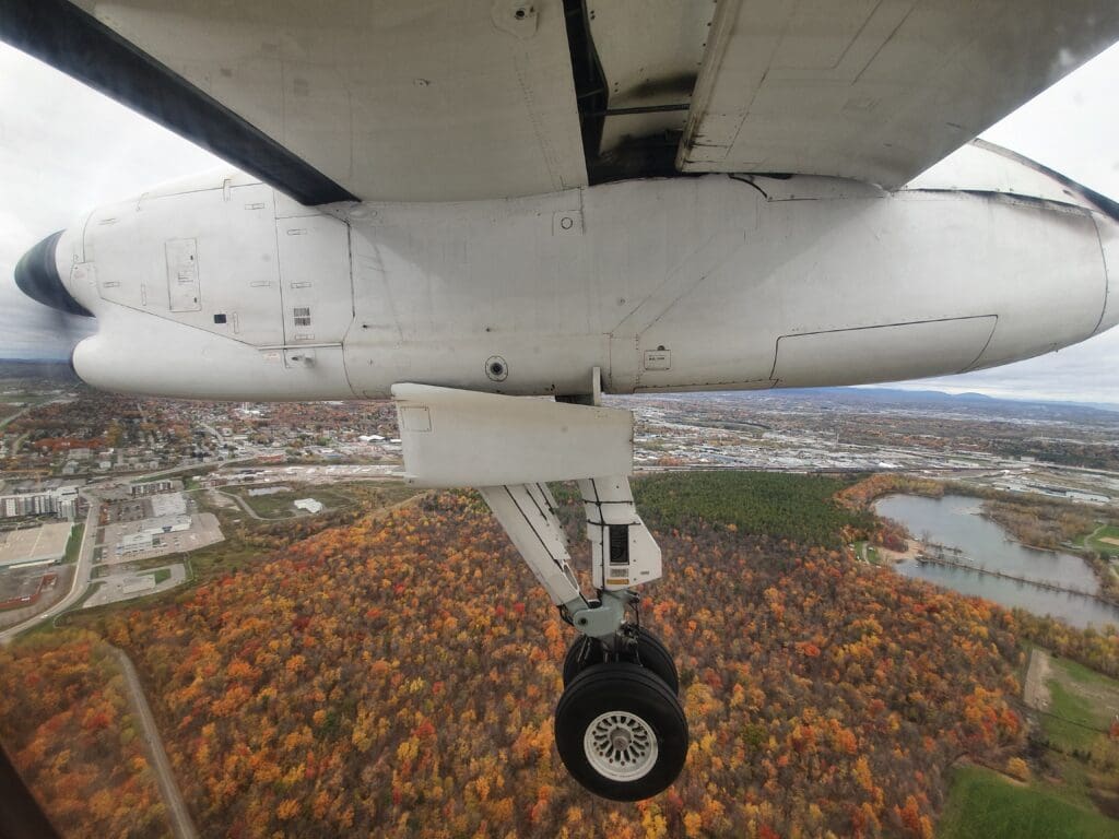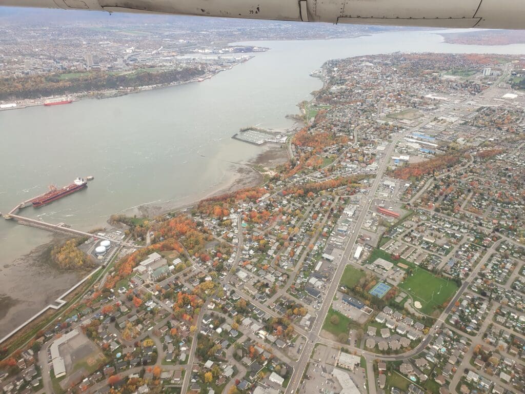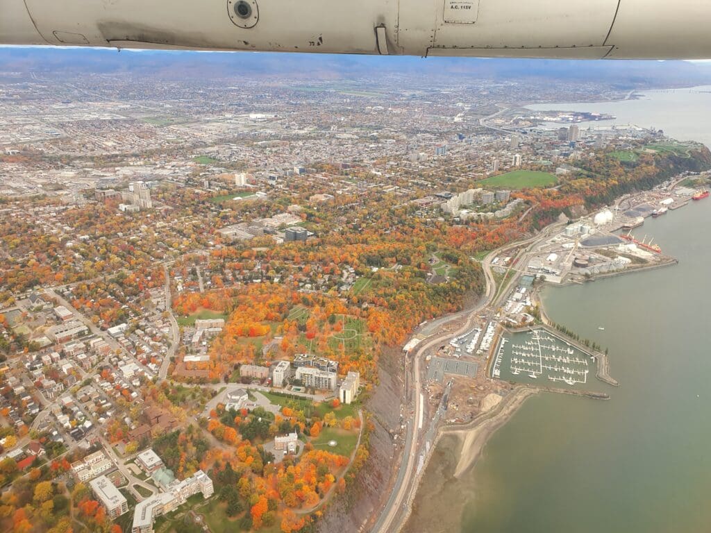 After passing the latter settlement, the Dash 8 made a short crossing of the river and a picturesque mixture of rectangular green fields and orange autumnal foliage could be seen below, somewhere south of the city of Lévis. Flying eastwards and thus in the opposite direction to Québec City, the aircraft eventually gently banked to line itself up for an approach to Runway 29. As we headed westwards towards the city, the landscapes below turned more residential and soon enough the Dash 8 crossed over the St Lawrence River once again at which point the flaps and landing gear were extended.