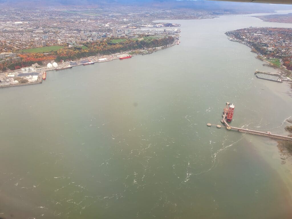 Within a couple of minutes, the Dash 8 skimmed the tops of the clouds at which point the seatbelt sign was reilluminated. This was followed by a short announcement from the flight attendant with the usual pre-arrival warnings regarding seat belts, seatbacks and tray tables before the flight attendant passed through the cabin ensuring all was in place for our arrival. Following the usual lumps and bumps as the turboprop rumbled through the clouds, at 1038 the Dash 8 broke free of these and the wide St Lawrence River appeared somewhere between the Québec industrial town of Donnacona and the village of Neuville.