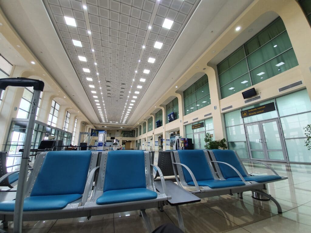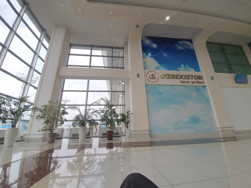 Being the sole passenger to disembark, I darted through the afternoon rain shower and over to the fence that surrounds the terminal. Just like Uzbekistan’s railway stations and other airport terminals, all those entering the terminal must pass through a security hut, with only those with tickets permitted to enter the terminal. Once there, two inquisitive guards in a green quasi-military uniform checked my passport and asked why I had arrived so early. After giving a satisfactory answer, I had my bags quickly scanned and checked before passing through a metal detector. After that, I walked up to the terminal and was met by another security check where my bags were scanned once again, and I passed through another metal detector. Following the rigorous and multi-layered security screening, I made it into the domestic terminal and was free to explore the sights and delights of the small landside area. There, a cash machine, a couple of vending machines, a currency exchange window, and a business lounge could be found. For the modern traveller, neither plug sockets nor wifi were provided. However, on the plus side, I found the landside area to be spacious, clean, and well-polished. The latter two points are thanks to the squad of three staff members who seemed to be cleaning the terminal non-stop from my arrival until the moment I headed through security.