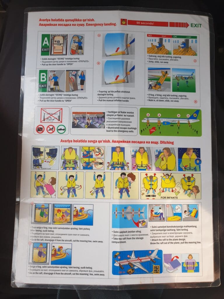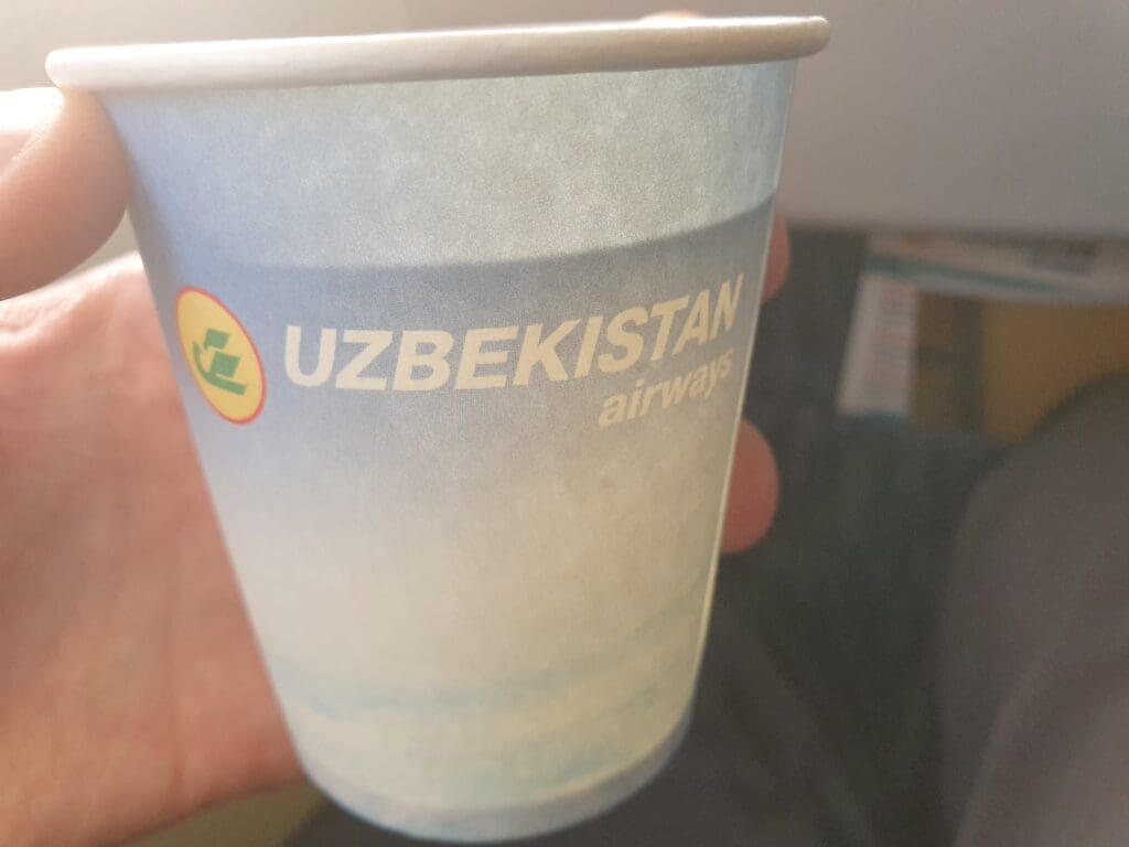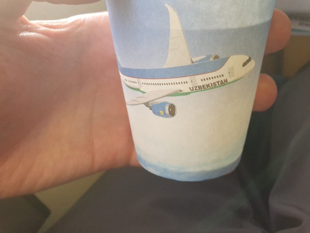 Once all passengers were seated, one of the friendly flight attendants came around offering water in paper cups – the only service that would be provided onboard the flight. These cups featured a nice design which included the airline’s Boeing 787 – the pride of the airline’s fleet and a near-omnipresent feature in its advertisements. True to Uzbek punctuality, at exactly 1800 on the dot, the stairs were backed away from the aircraft, and the door was closed by one of the off-duty pilots. After this, the Purser performed a welcome speech in Uzbek, Russian, and English before the overhead screens extended and played a rather vintage-looking safety video three times in the aforementioned three languages. As this played, the passenger in front of me decided it would be a good idea to recline his seat, completely squishing me in before karma ensured he got a telling-off from one of the flight attendants as they passed through the cabin ensuring all was ready for departure.