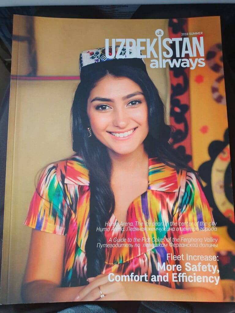 Despite not being a particularly vintage jet, stepping onboard was a little like stepping back in time, with yellow cabin lighting illuminating the chunky seats. These were separated by large armrests, each featuring an audio channel selector. In Economy, each seat was covered in dark blue fabric with a repeating pattern and topped with a large adjustable headrest that was partially covered by a disposable antimacassar featuring the airline’s name in English and Uzbek along with its swan motif. The seats themselves were well-padded and would undoubtedly make for a comfortable journey, were it not for the fact that the legroom provided was absolutely terrible! Thus, upon sitting down, I instantly felt some pity for those passengers flying on the airline’s Boeing 757s to destinations such as London Heathrow and Vladivostok. In terms of wear and tear, there were several scratches around my seat and on the windows to my left which prevented any high-quality photos from being taken through these. Plus, the fabric appeared to be coming away from the seat in front which was rather noticeable when I lowered my tray table. Finally, it ought to be noted that the cabin appeared to be in a clean condition with no rubbish visible around my seating area. Lastly, turning my attention to the seat pocket, I found a safety card and a pristine copy of the summer 2019 edition of the airline’s magazine.