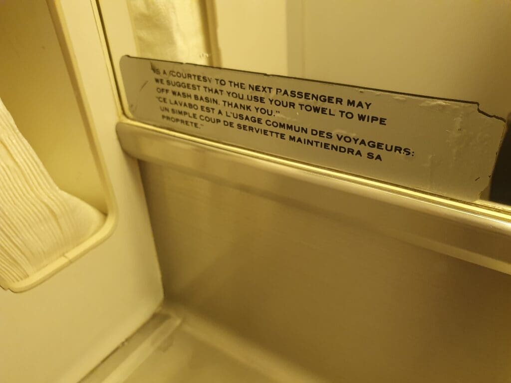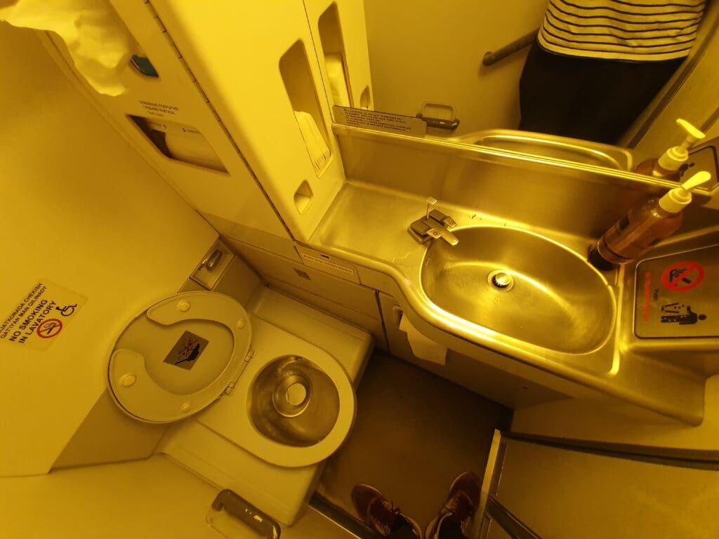 That afternoon, all passengers from the first bus boarded in a quick and efficient manner, and boarding seemed to have been completed by 1735. However, as it turned out, another bus full of stragglers would arrive twenty minutes later. With two free seats next to me, and little to do during this wait bar soak up the aircraft’s atmosphere and listen to the funky boarding music, I decided to make a quick trip to one of the aircraft’s lavatories. As you would hope, this was stocked with all the basics, however, contrasting with the Air Astana Boeing 757 lavatories that I had visited that morning, these were incredibly worn, battered, and emitted an unpleasant stench.