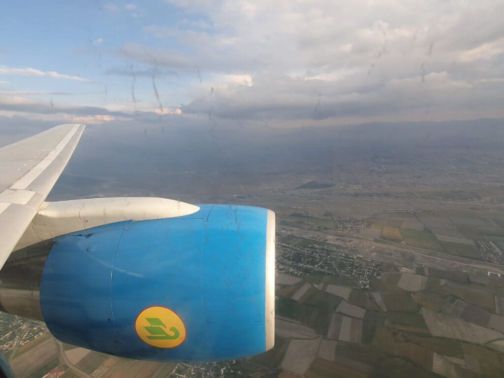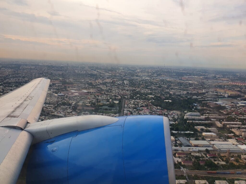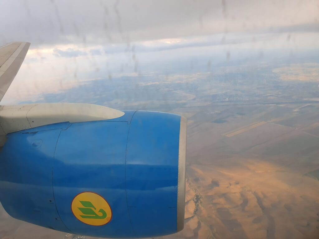 As we banked, the mountains to the east of Tashkent briefly appeared, offering a picturesque view of Uzbekistan before the clouds rolled in, obscuring any further sights of the ground until we neared Samarkand. With Tashkent sitting in close proximity to Uzbekistan’s border with Kazakhstan, unsurprisingly the Boeing temporarily entered Kazakhstani airspace for a few short minutes before reaching the Uzbek cities of Gulistan and Jizzakh. A mere 13 minutes into the flight, the aircraft levelled off at its low cruising altitude of 24,000 feet. Unsurprisingly given the short length of the flight, the seatbelt signs remained illuminated for the entire journey, whilst the flight attendants remained firmly in their jumpseats. As the cabin settled into the brief cruise, passengers were left to enjoy the noise of the aircraft’s two Pratt & Whitney engines, with no announcements made until we neared the top of descent.