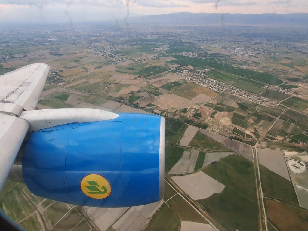 As the safety video neared its end, the Boeing’s two Pratt & Whitney PW2037 engines powered into life without too much noise or vibration, and a few minutes later the Boeing 757 lurched forwards out of its stand. From our parking position, nothing more than a very short taxi was in store until we reached the end of Runway 08L. Without holding, at 1814, the Boeing entered the runway and performed a powerful rolling takeoff. The light load combined with the Boeing 757’s reputation as an infamously overpowered jet meant that rotated up into the skies in no time, allowing for fantastic vistas of Islam Karimov Tashkent International Airport and its rows of both stored and active aircraft, including Uzbekistan Airways’ rare and sadly retired Avro RJ85s and Ilyushin Il-114s. Within seconds of taking off, the mostly flat landscape of Tashkent appeared as we climbed over the city’s suburbs before making what seemed to be fairly steep bank that put us on course for Samarkand.