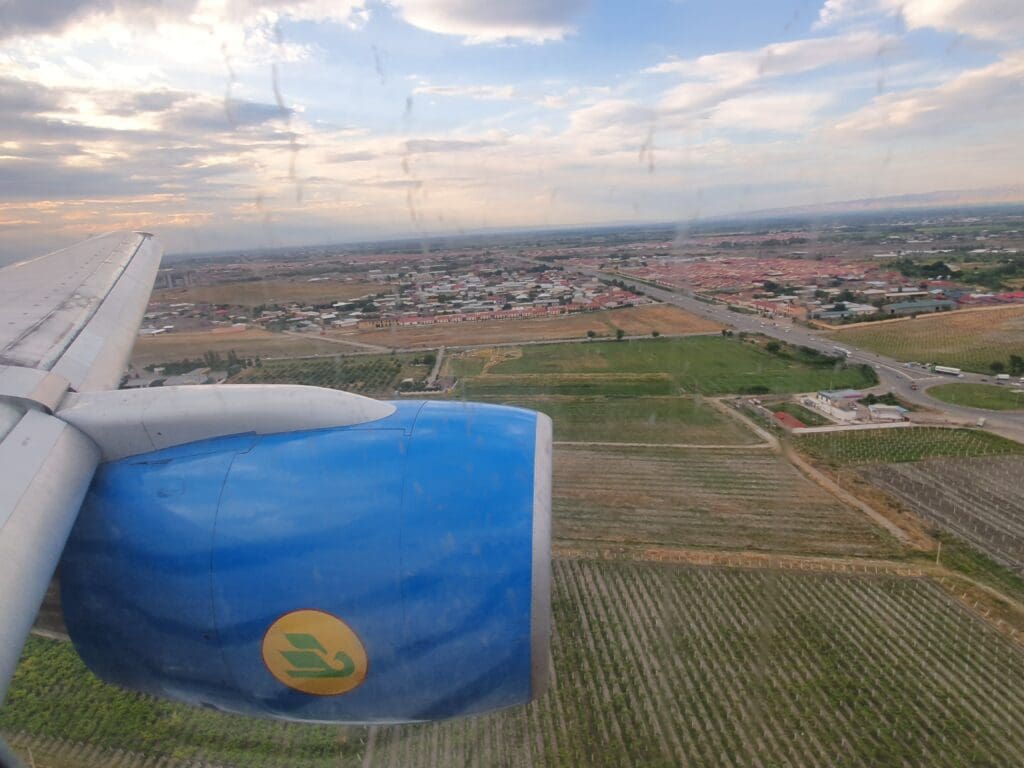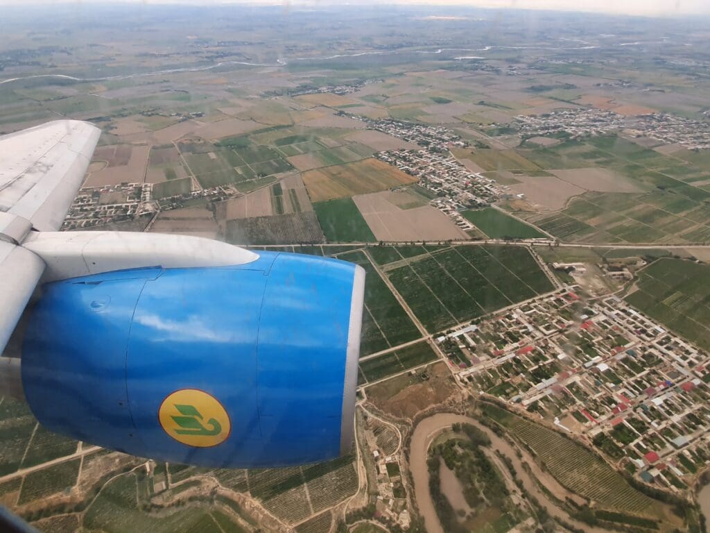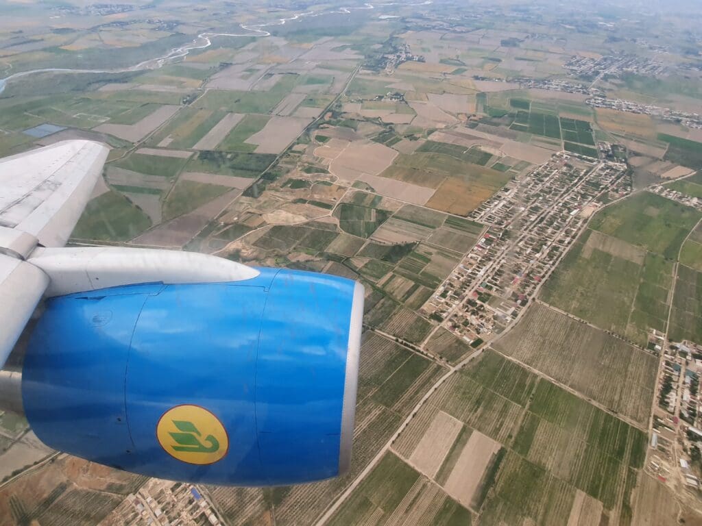 Just three minutes after the Boeing had levelled off, the Purser announced that the descent into Samarkand would soon commence. At that time, passengers were asked to ensure their window blinds were up, tray tables were stowed, seatbacks upright and seatbelts fastened. However, as the crew remained strapped into their seats for the entire flight, there was technically no way for them to enforce this! Soon, the Boeing passed through a thin layer of clouds, revealing the beige fields of rural Uzbekistan below. These fields gradually turned greener as we approached Samarkand, signalling our imminent arrival.