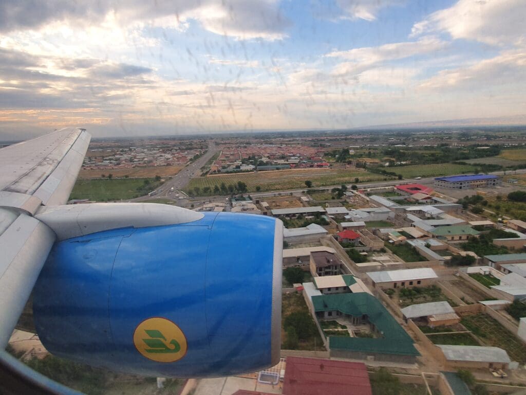 Smoothly cutting through the Uzbek skies, it wasn’t long before the outskirts of Samarkand appeared. After making a slight turn, the aircraft entered the downwind leg for an approach to Runway 09 at Samarkand Airport, with the flaps were gradually lowered, and the landing gear extended as we lined up for the final approach. At 1845, just 24 minutes after taking to the skies, the Boeing 757 floated gently down over Samarkand’s residential and industrial areas, crossing the airport perimeter fence before making a soft touchdown on Runway 09.