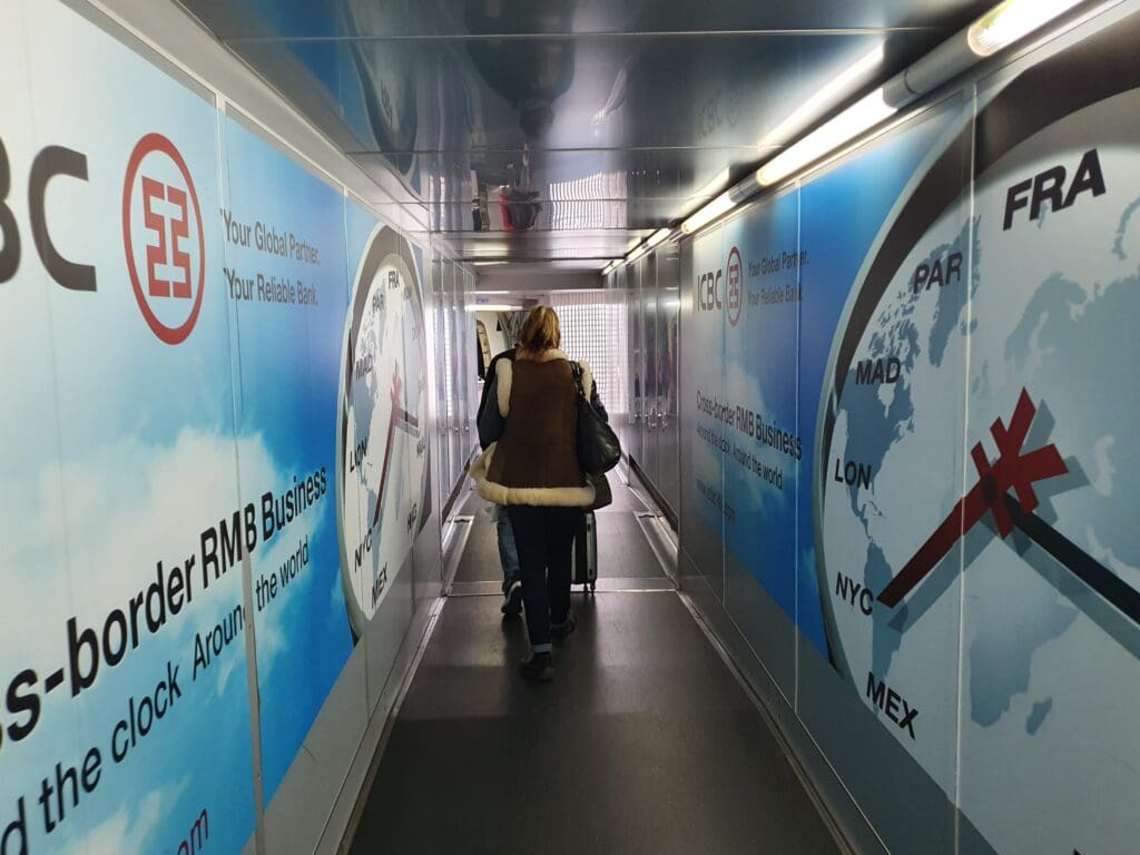 After my pre-flight stroll, I wandered back to Gate B42 and took a seat next to one of the pier’s large windows. At that time, a stream of freight could be seen making its way into the belly of the aircraft ready to be hauled across the Atlantic along with containers filled with passengers’ bags. When 0920 arrived, the gate agent conducted an announcement in English and Germinal advising that boarding would commence shortly and would be conducted in accordance with the zones listed on passengers’ boarding passes. Around a minute later, priority passengers, i.e. those in Zone 1, were invited to proceed for boarding, soon followed by those in Zone 2, and then those in my zone, Zone 3, the rearmost Economy cabin. Wasting no time, once the announcement for those in Zone 3 had been made, I joined the short queue that led to one of the gate’s automated barriers. Whilst these rejected the boarding passes of a fair number of passengers that morning, after scanning my boarding pass, these let me through without any issue and I soon journeyed down towards the waiting Boeing 777. As is often the case for widebody aircraft, two jet bridges were connected to the aircraft with those in Economy directed to head down the second of these. However, prior to heading down the bridge, two Air Canada agents could be seen waiting to undertake a final boarding pass and identity check. Fortunately, this went quickly and without issue and I soon trundled down the aircraft.