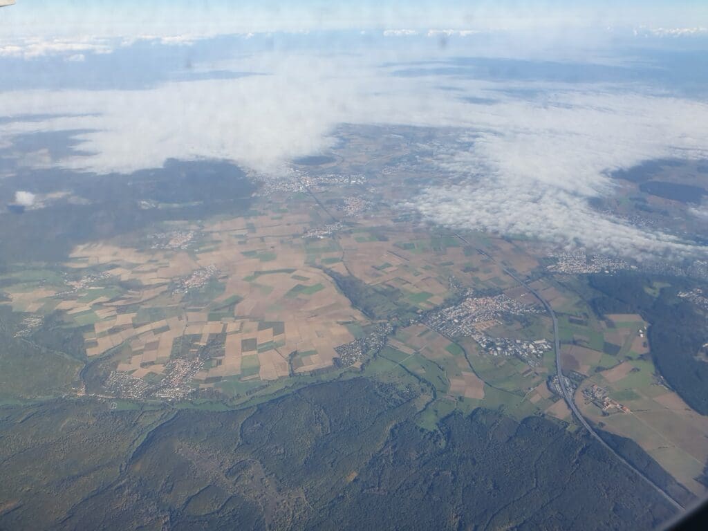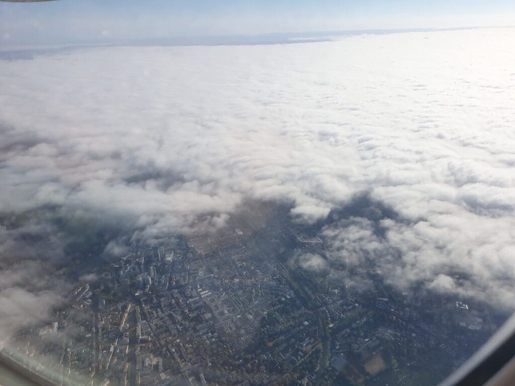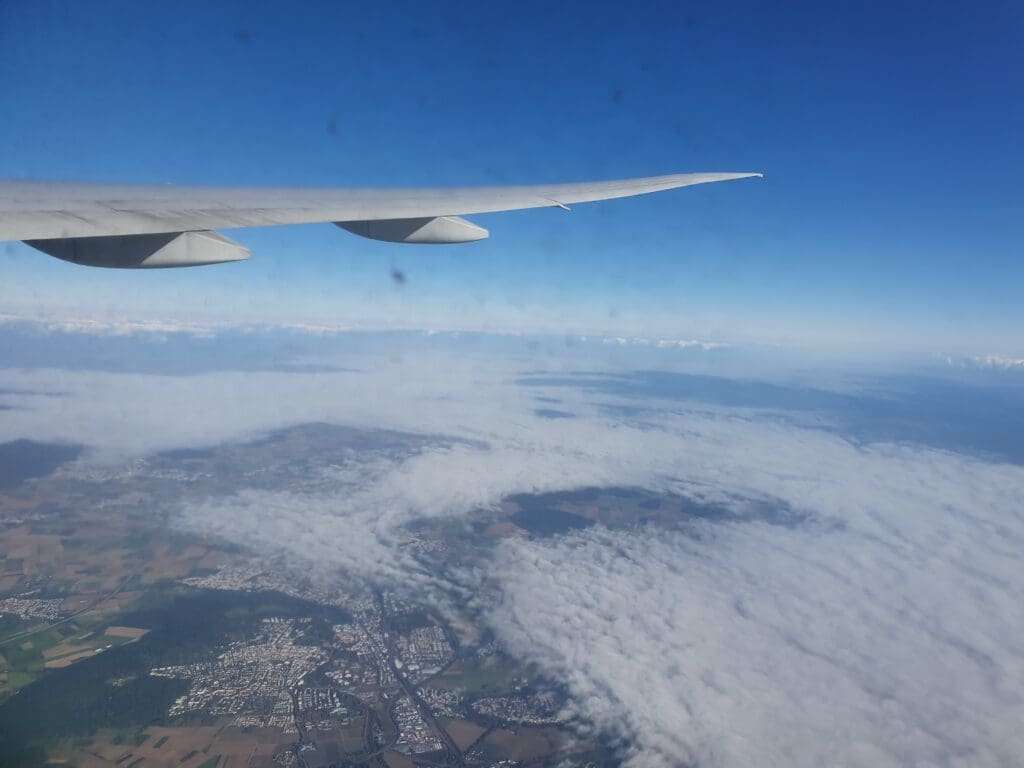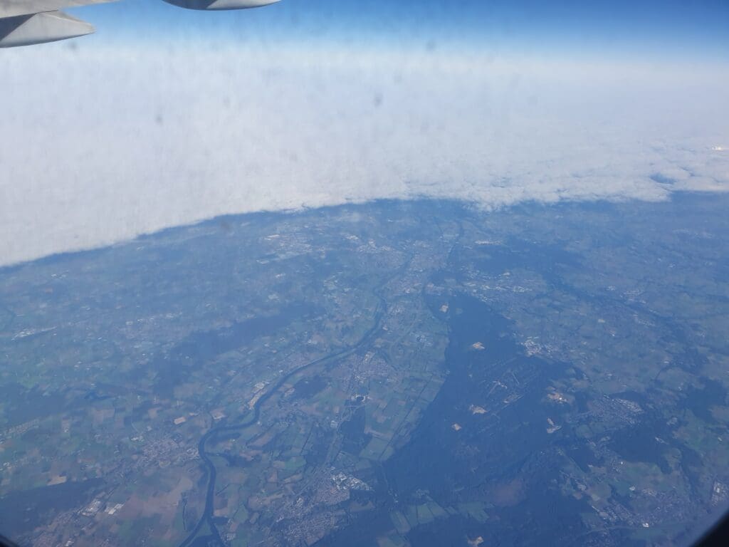Several minutes after leaving Frankfurt behind, the clouds below temporarily parted and revealed the countryside and several towns of Germany’s Rhineland-Palatinate and North-Rhine Westphalia regions as the Boeing made its way towards Cologne. Unfortunately by the time the jet reached the historic city, the clouds had returned and thus nothing of this could be seen. Approximately twenty minutes after taking to the skies, the aircraft levelled off at its initial cruising altitude of 34,000 feet at which point the flight was nearing Germany’s border with the Netherlands, crossing this near Roermond. Once in Dutch skies, the aircraft flew along the country’s southern border with Belgium, crossing this various times as it journeyed towards the North Sea. However, thanks to the omnipresent cloud cover below, neither Belgium nor the Netherlands could be seen that morning. Fortunately, some entertainment was provided when our aircraft overtook a Cancun-bound Lufthansa Airbus A340-300 that had taken off a few minutes ahead of our flight and was leisurely tootling along two thousand feet below.
