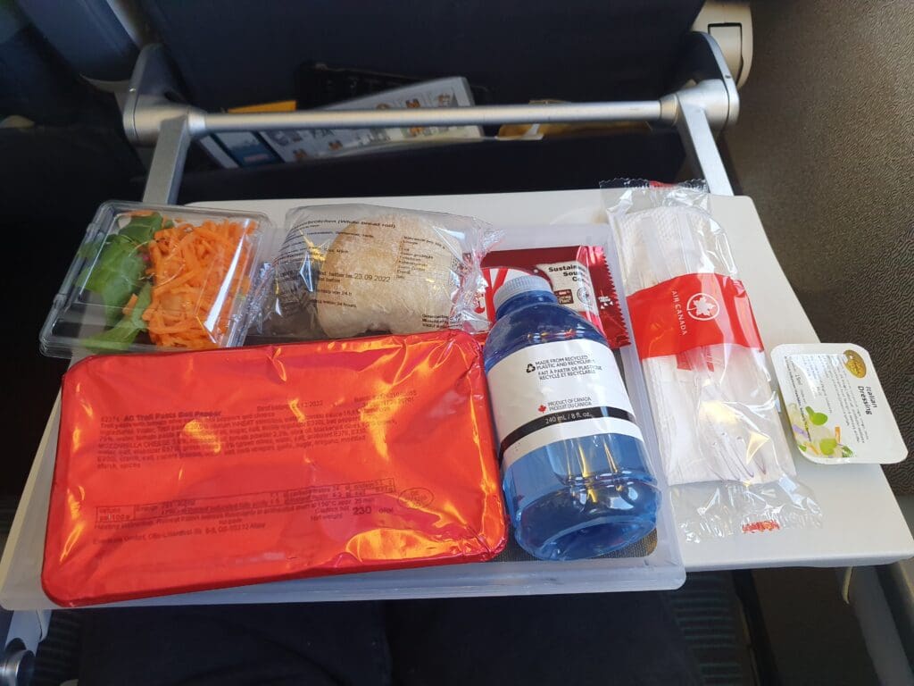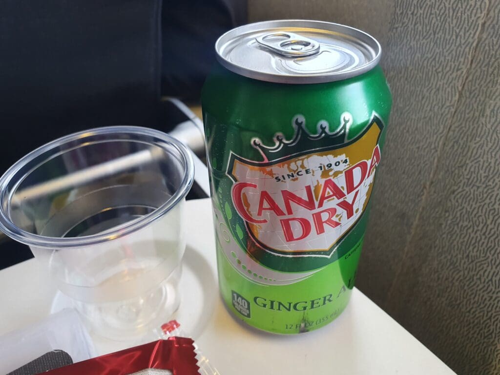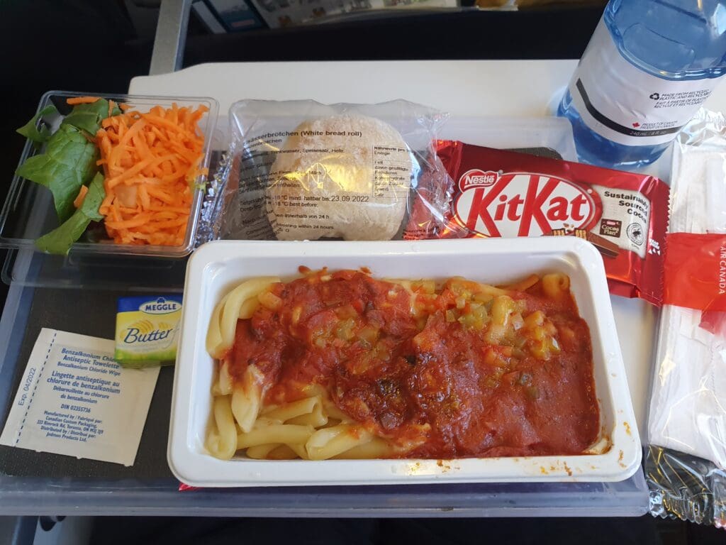 With little deliberation, I opted for the latter and I was soon passed a small tray that featured the main dish, a 240ml bottle of water, a small salad with a tub of Italian dressing, a bread roll and a packaged lump of butter, and a KitKat for dessert. Meanwhile, a packet containing the usual plastic cutlery, salt and pepper sachets, a serviette and wet wipe could also be seen on the tray. With no further communication, the flight attendant steamed down the cabin and a minute later another flight attendant who seemed to be equally cold asked for my choice of drink. Given my final destination, I opted for a Canada Dry ginger ale and to my delight I was given the full 355ml can! Slightly less impressive, although not particularly worthy of complaint, was the fact that this was handed to me along with a plastic cup, with no offer of ice, and no pouring undertaken by the flight attendant. With everything on my tray table, I began to tuck into the Air Canada lunch which I found to be fairly mediocre. Whilst I was left with nothing to complain about in terms of the quality of the main dish, nothing about it really stood out. Meanwhile, whilst the quantity of this was sufficient for lunch, I did find the portion size to be on the smaller side of things when compared to the offerings of other full service airlines. Other than the coldness of the two crew members, my only real complaint about the meal was the minuscule tray that this had been delivered on which made returning the tray to the crew members a high-risk balancing operation with the potential to tip everything from this onto the aisle seat occupier.