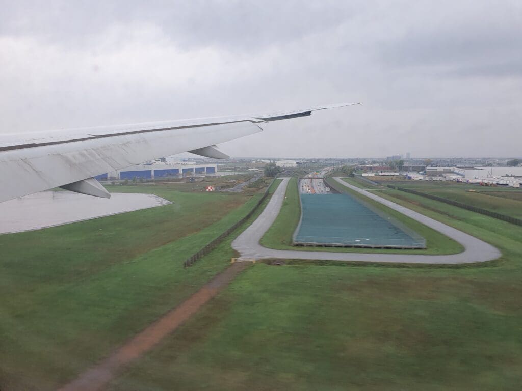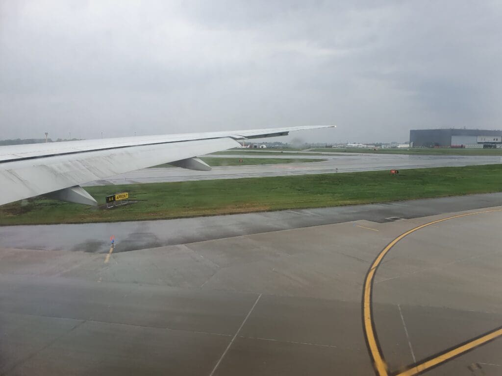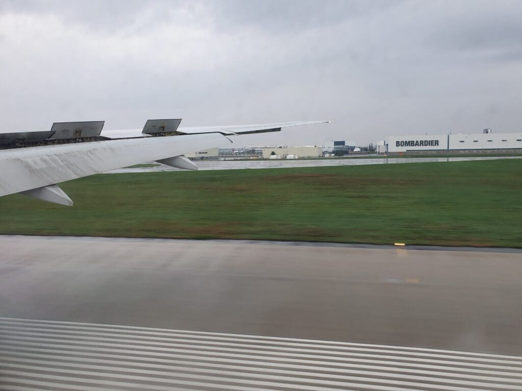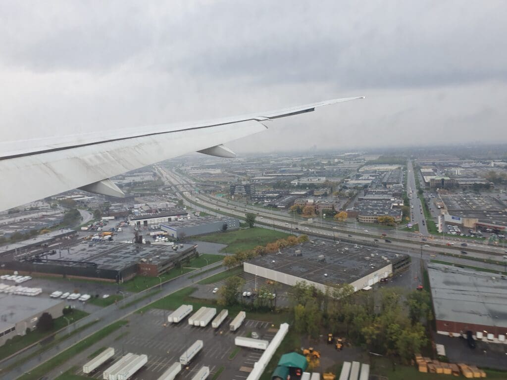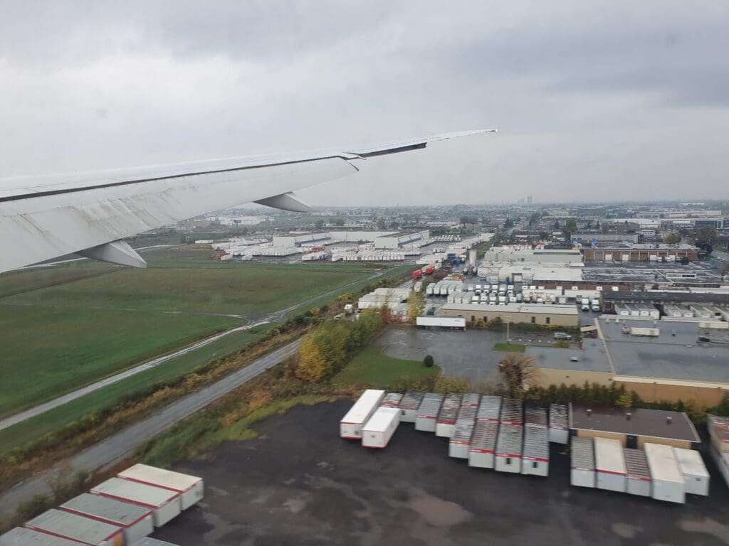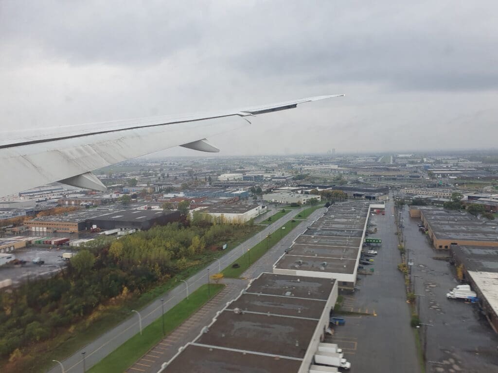 Whilst still in the clouds, the flaps were extended and at 1225, the Boeing finally broke free of these. Sitting on the right hand side of the aircraft, I was offered a good view of Montréal’s residential suburbs to the west of the city centre such as Saint-Leonard, Sault-au-Récollet and Bois-Franc, whilst the Prairies River could be seen through the mist. As the aircraft neared the airport, the residential neighbourhoods were replaced by the usual mixture of factories and warehouses that often surround airports across the world. At 1229, the jet whizzed over the airport’s perimeter fence and the locally based Bombardier factory appeared followed by Air Canada’s hangars as the Boeing made a firm touchdown on Runway 24L.