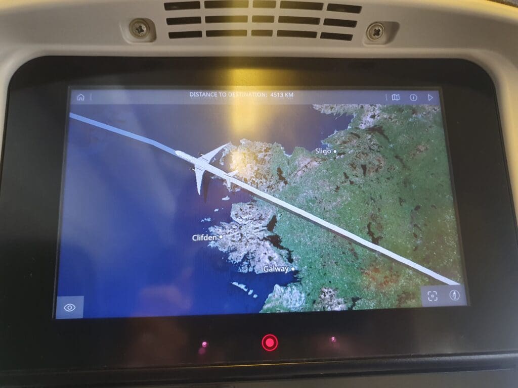 As I ate lunch, a few gaps in the clouds revealed the English countryside of the Home Counties, as well as several towns, whilst a short time later the rural border areas between the English county of Herefordshire and the Welsh county of Monmouthshire could be seen. Following a six minute flight in Welsh skies, the Boeing passed to the south of the town of Aberystwyth and headed out over the Irish Sea. During this stage of the flight, the crew began to collect passengers’ trays, which was done quickly and efficiently, in spite of the fact that the aircraft was flying through a patch of turbulence while this was underway which resulted in the aircraft climbing up to 35,000 feet. After ten minutes spent flying over the Irish Sea, the Boeing made landfall to the south of Dublin near the coastal town of Wicklow. Contrary to the captain’s speech which mentioned we would pass over Shannon, instead, the jet cut across Ireland, travelled up to County Mayo, passing to the south of Castlebar and over Achill Island before heading out over the Atlantic. Unfortunately thanks to the clouds, nothing of Ireland could be seen that morning.