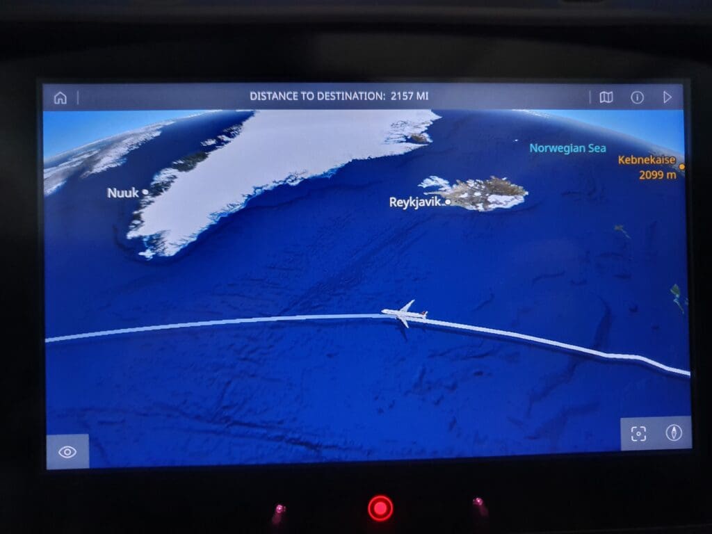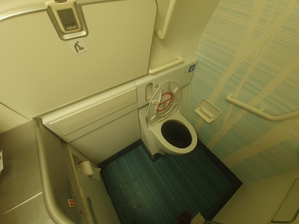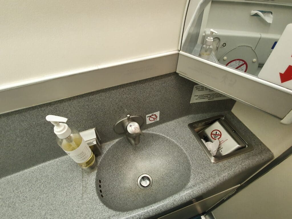 After exploring the inflight entertainment system, I settled down and had a brief nap before doing some work. As the Boeing powered its way westwards across the Atlantic, the first hour of its oceanic crossing proved uneventful. However, several hundred miles to the south of Reykjavik, the aircraft passed through a brief patch of turbulence which proved strong enough to warrant the reillumination of the seatbelt signs for around ten minutes. Once passengers were free to move about again, around halfway across the Atlantic I decided to pay a trip to one of the lavatories at the rear of the aircraft. Whilst I had noticed a fairly constant stream of passengers heading to and from these for the duration of the flight, I was pleased to find this bathroom to be in a clean state although this did appear to be slightly battered.