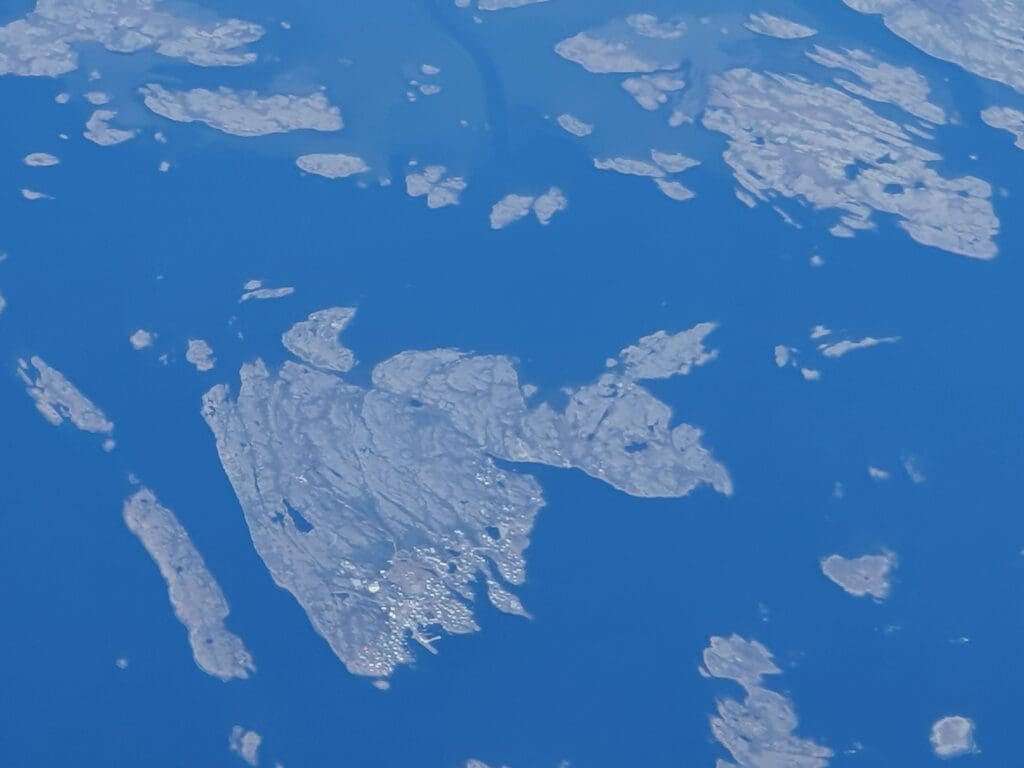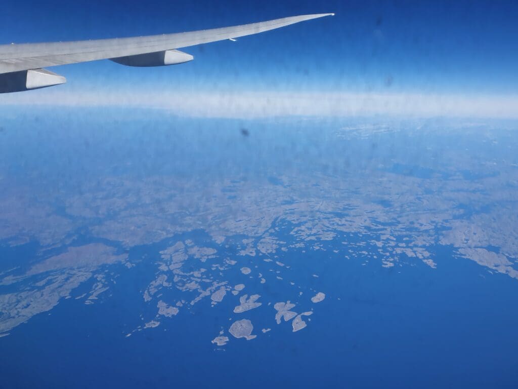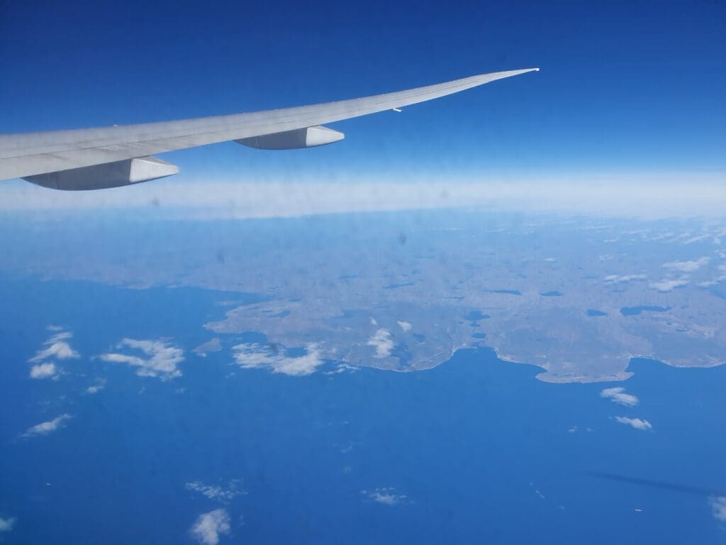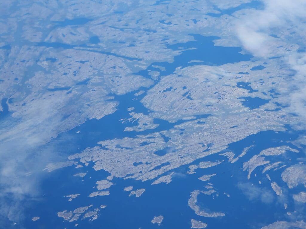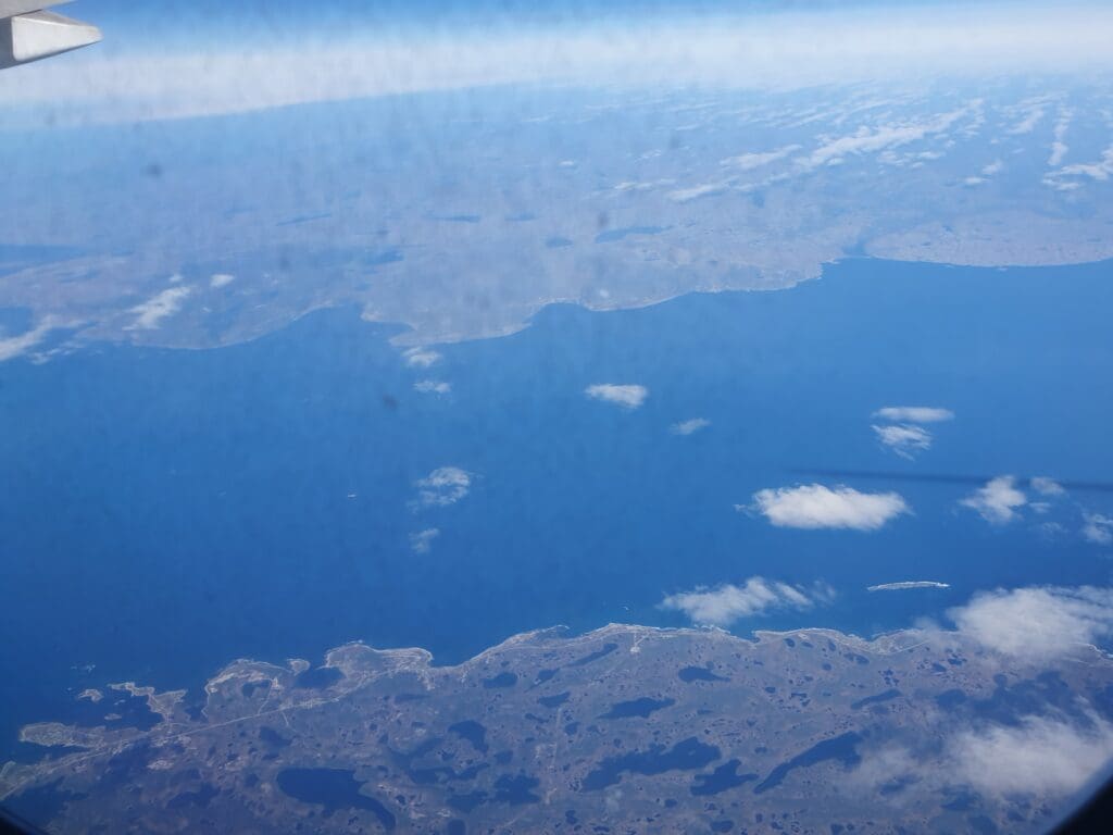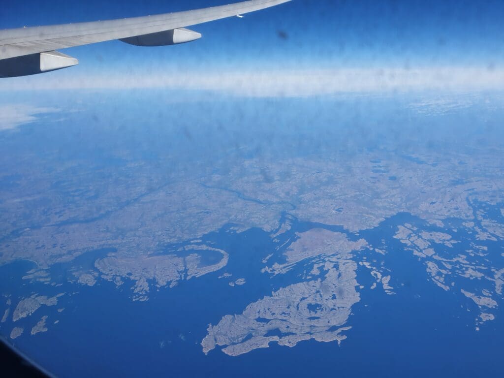 In the short time that I was away, the aisle seat occupier had fallen asleep. So as not to disturb this passenger, I decided to take one of the multiple vacant aisle seats at the rear of the cabin. It is worth noting that whilst in the cruise, no drinks round was made and perhaps owing to Covid precautions, only small bottles of still water had been left in the galley for passengers to take. By the time I had done some more work, had another nap and partaken in a brief walk around the cabin the flight was nearing the Newfoundland coastline. Noticing that the aisle seat occupier had woken up, I made my way back to my seat in time to get my first glimpse of Canada since 2002 and of North America since 2006.