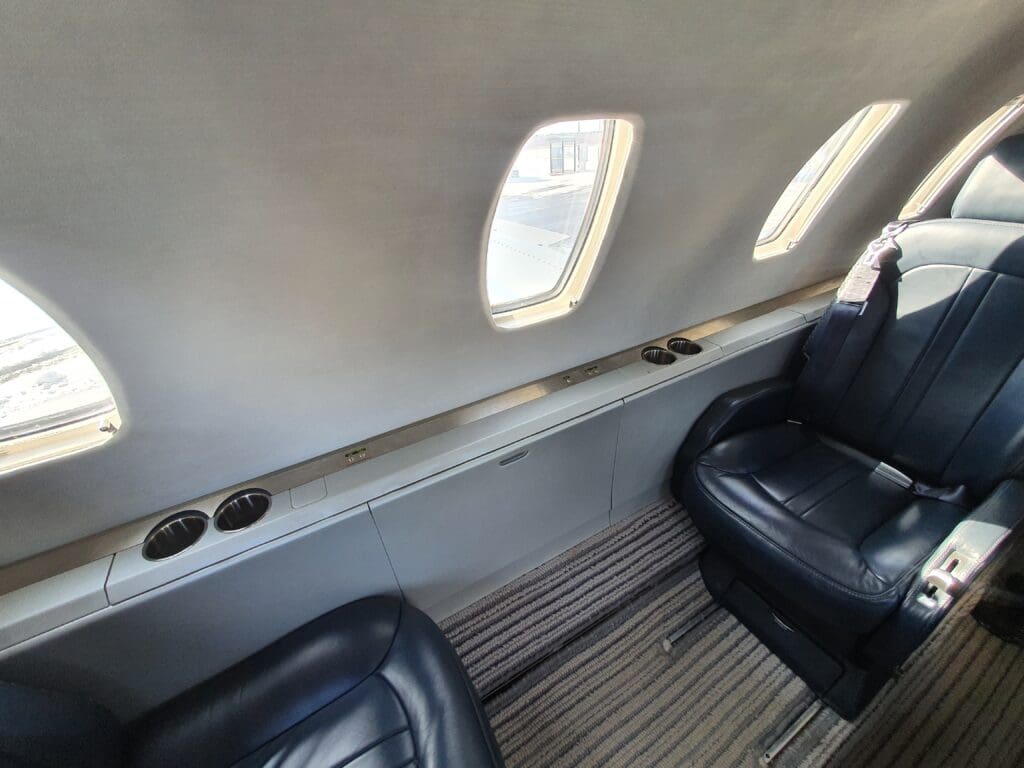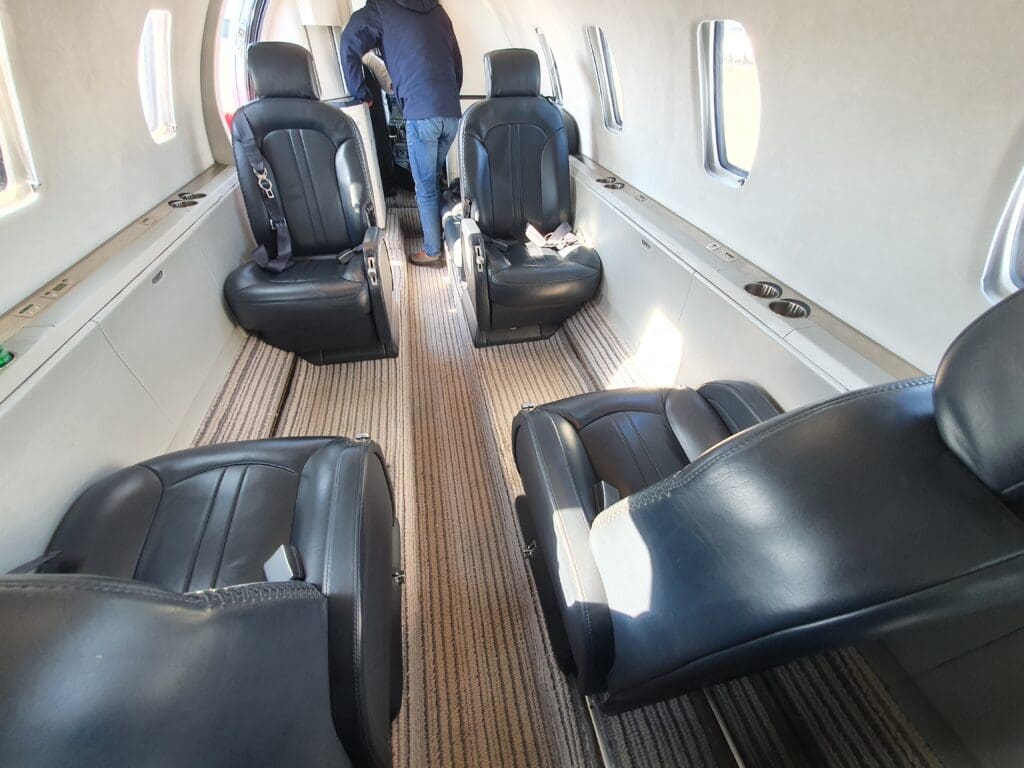 A photograph of the aircraft’s interior during its time with Luxaviation shows its seats to have been covered in blue leather. However, following its delivery to Sweden, Jivair AB undertook a costly refresh of these with each seat now sporting very dark blue/black leather and complete with ornate stitching. Meanwhile, smart beige and brown striped carpets line the cabin floor whilst a panel of light grey plastic and polished metal runs along either side of the cabin. Inside, the cabin height of 1.73 metres meant that I did not have to bend my head too much as I journeyed towards the rear of the aircraft. Furthermore, measuring 1.71 metres across, this seemed to be comparatively spacious compared to the cabin of the Citation Bravo that I had previously flown in – with this being 1.43 metres tall and 1.49 metres wide.