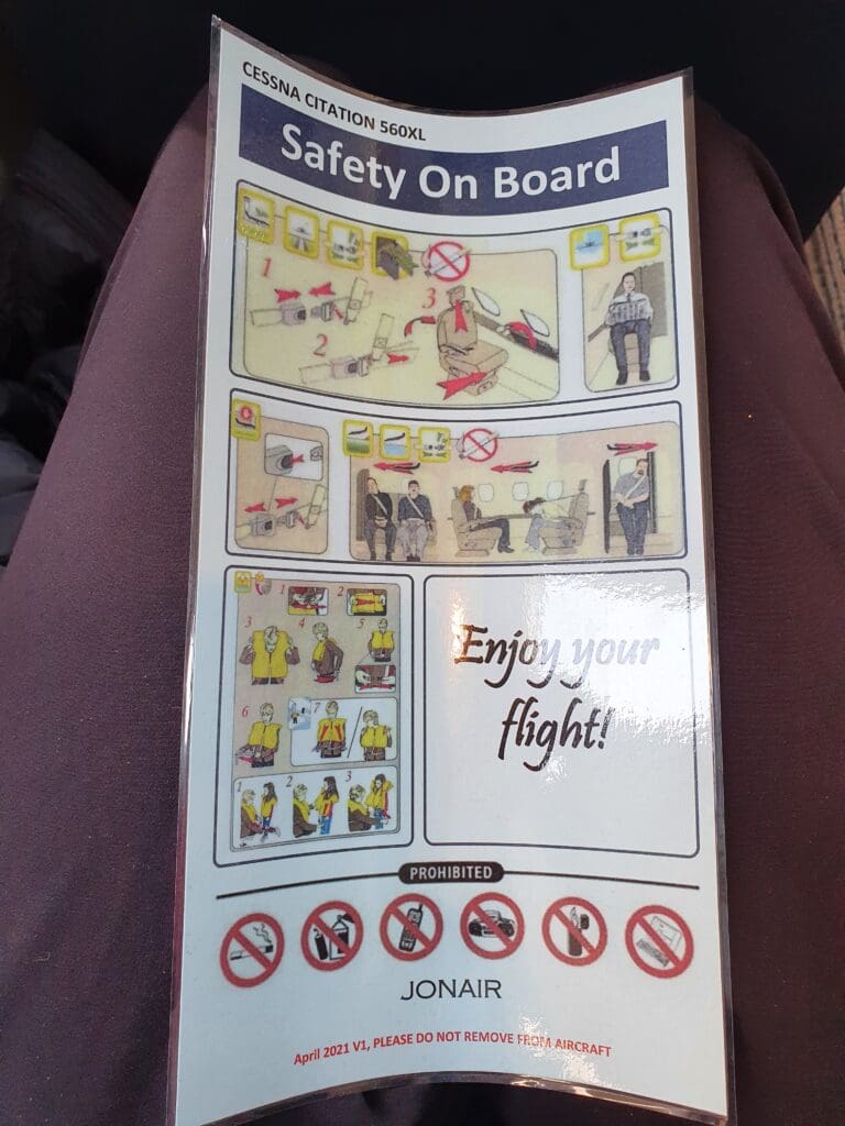 As one would likely expect from a private jet, upon sitting down I found the seat to be highly comfortable – offering a good amount of legroom whilst also being soft and well padded. In the panel to my left underneath the Citation’s distinctively shaped windows, two buttons could be seen – one for the reading light and the other to illuminate the pull-out table. These lights are located above the seats alongside an air vent. Meanwhile, a literature compartment in this panel contained two Jonair-branded safety cards, identical in design to those found on the operator’s other aircraft. As one would expect, the aircraft appeared to be in a spotlessly clean condition, and other than a few very minor scratches on the metal side panel, I failed to spot any signs of wear and tear. It is worth noting that no screens were provided inside the cabin, and I also failed to spot any power ports which may prove slightly annoying for those wanting to charge or power their devices on a longer flight.
