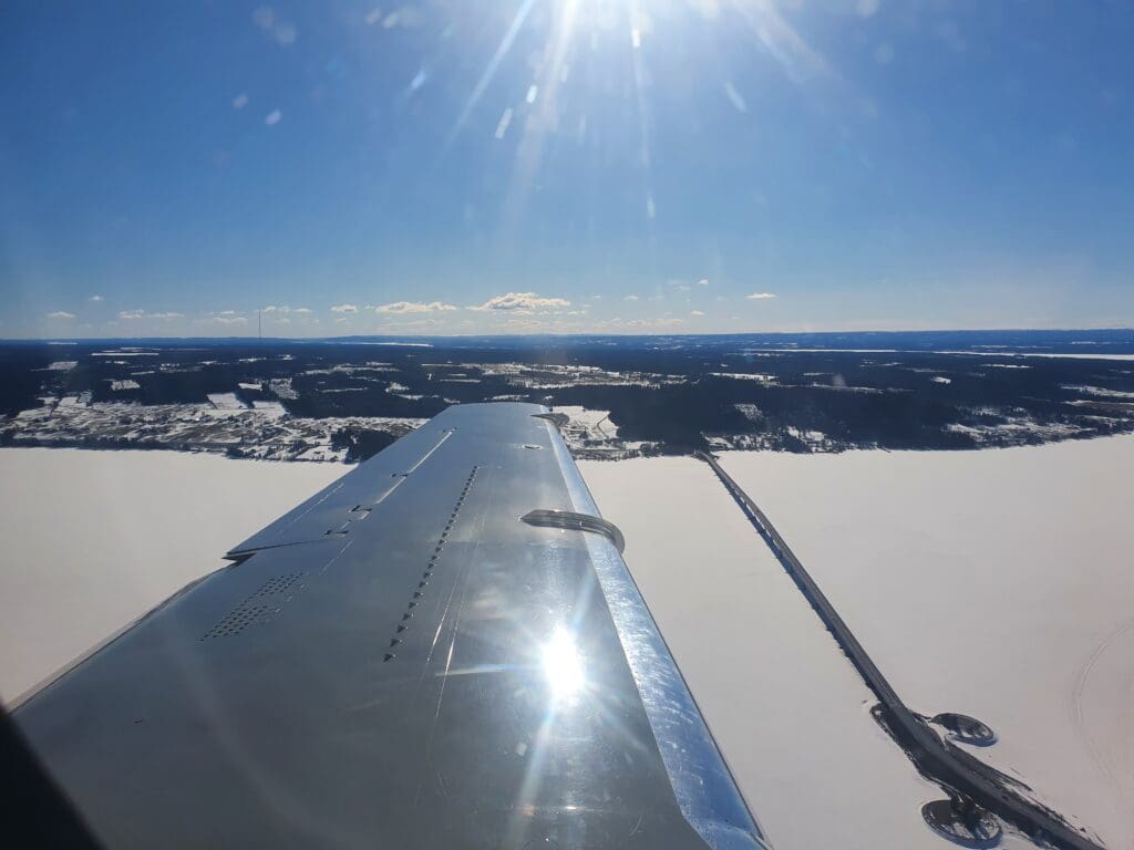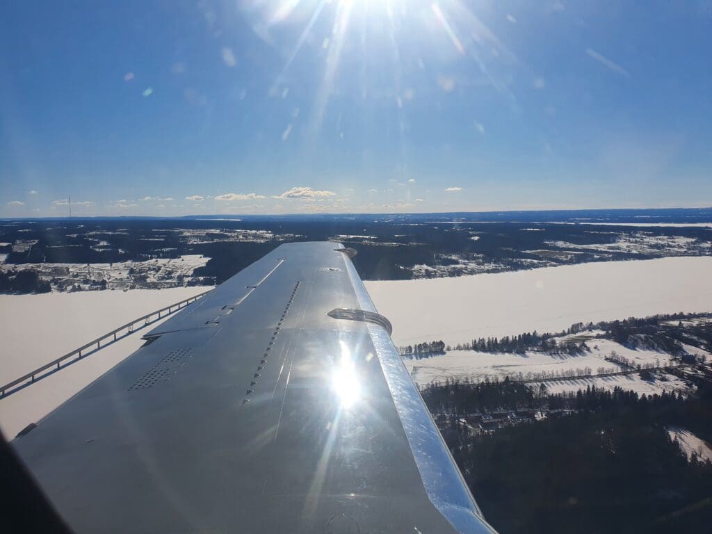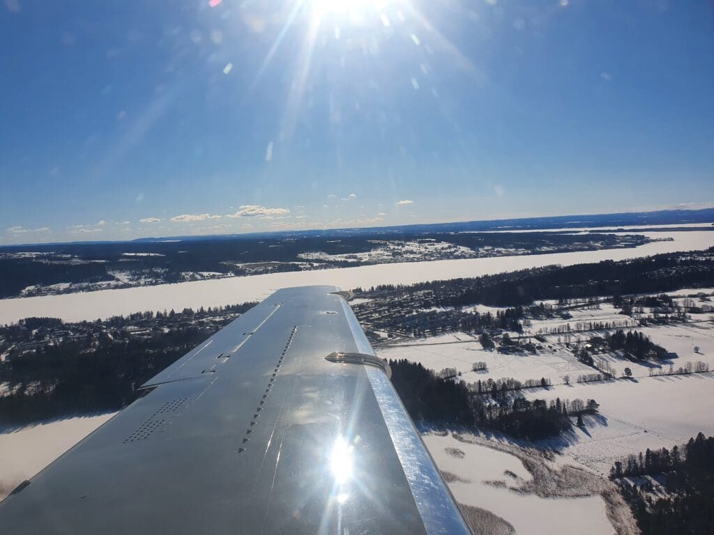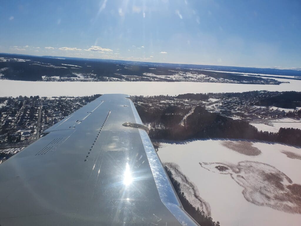 A short time after crossing the frozen waters of the Indalsalven, one of Sweden’s longest rivers, those on the right-hand side of the cabin could be seen snapping away as the buildings of Jämtland’s capital appeared off the Citation’s right wing. Meanwhile, from my seat on the left-hand side of the aircraft, as we passed Östersund I was offered views of the small town of Ope and the 330-metre tall radio and television mast, the Brattåsmasten, one of the tallest structures in Sweden. From there, the Cessna then sank over the frozen snow-covered waters of Storsjön lake and turned to line itself up for an approach to Östersund’s Runway 30.