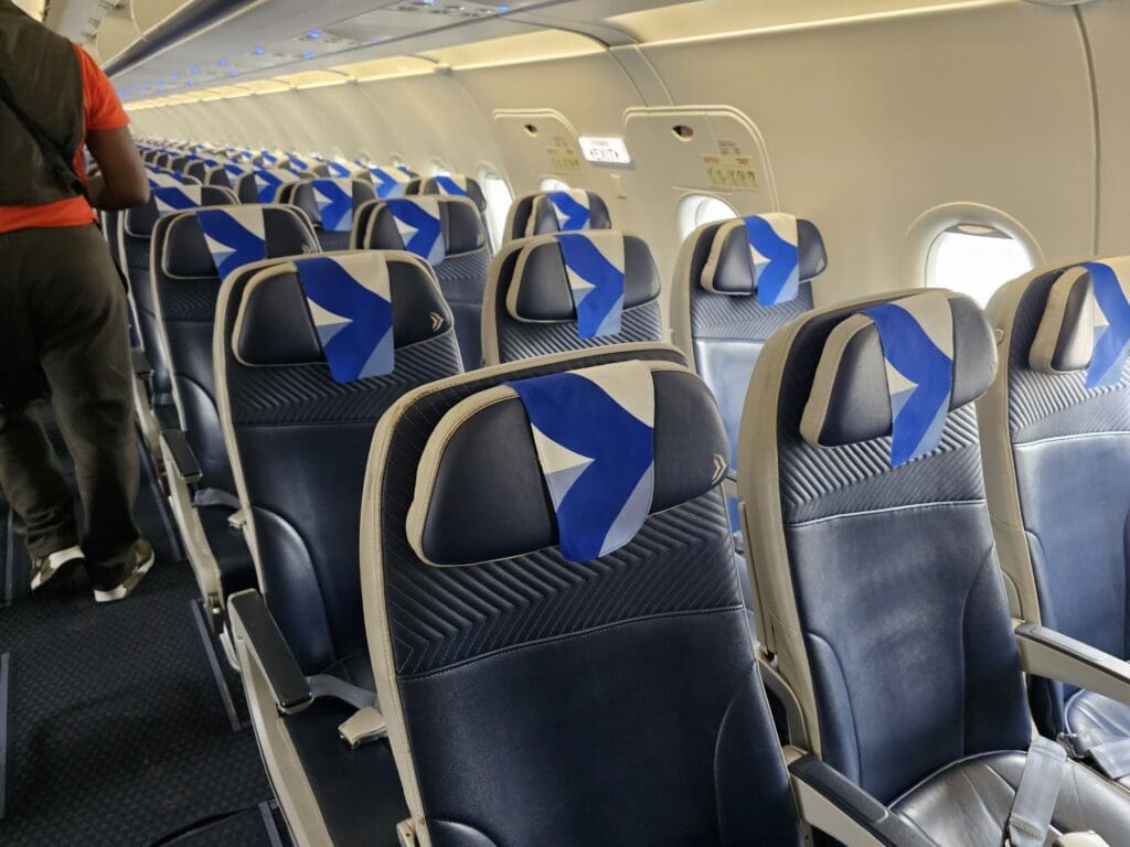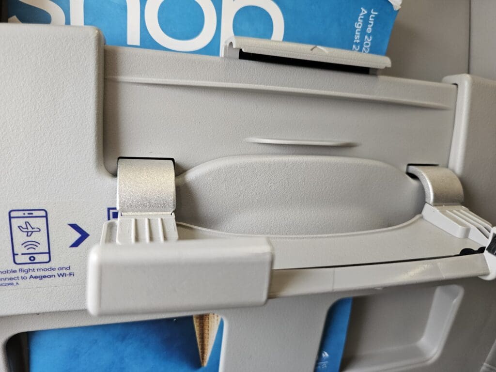Examining the aircraft’s seats, these came in the form of Collins Aerospace’s Meridian seats and were customised by a smart blue pleather cover with a swirling pattern and cream-coloured sides. Those in the forward half of the cabin were topped with an adjustable headrest on which the Aegean Airlines motif could be seen embroidered, whilst all came with an Aegean Airlines branded fabric antimacassar. Each seat is complete with a USB-A port, coat hook, literature compartment and seatback pocket. In terms of layout, Aegean Airlines’ Airbus A320neos feature a European standard configuration of 180 seats, with this being the same number as those operated by British Airways, ITA Airways, Lufthansa, Scandinavian Airlines and a few others.