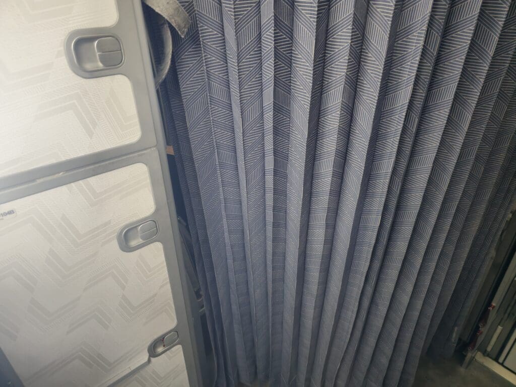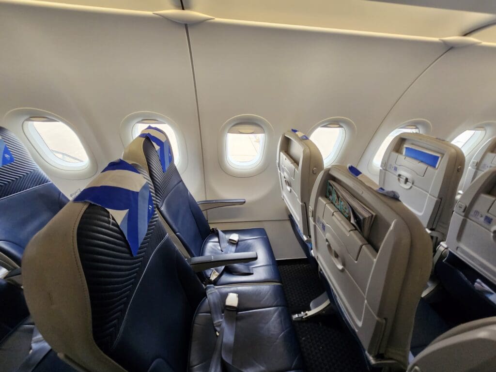 As I stepped into the forward galley, two crew members could be seen – one of whom was in the midst of pouring drinks for those in Business, whilst the other stood cheerily welcoming passengers and held a wicker basket containing soft jelly sweets. Left with a good first impression, I turned right and made my way into the cabin with high expectations. Despite Aegean Airlines’ award-winning status, as on most European narrowbody aircraft, the airline does not offer a ‘real’ business class hard product. Instead, a ‘Euro-Biz’ product is offered, which consists of Economy seats with a blocked middle seat and a movable curtain which separates this cabin from Economy. That morning, the first three rows of the aircraft had been blocked off for use by those in Business Class, and this cabin seemed to be almost full by the time I boarded the aircraft.