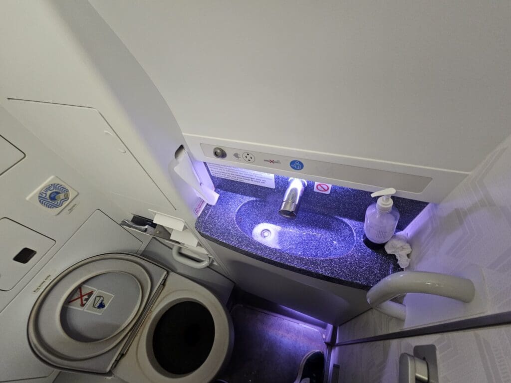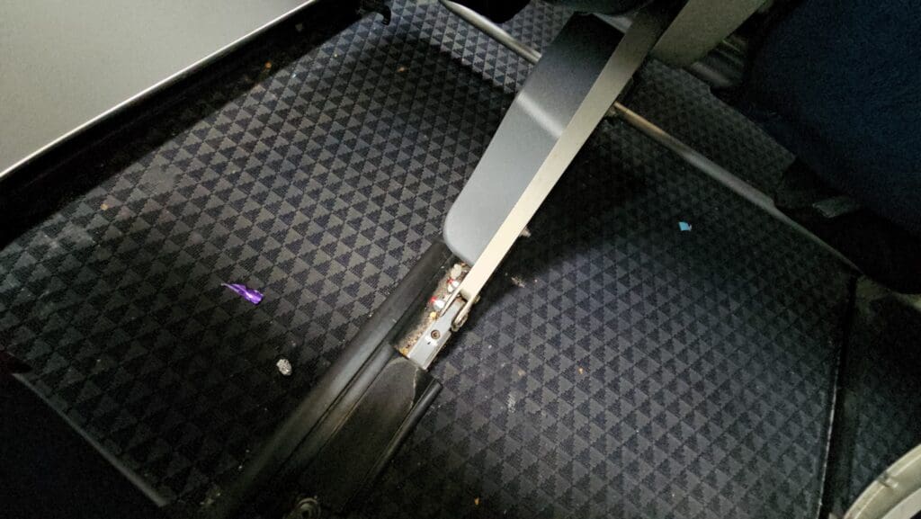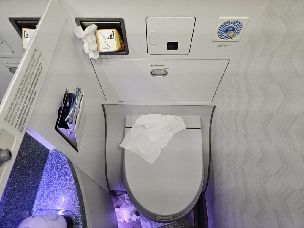 As I made my way to the rear of the cabin, I received another friendly greeting before I squeezed my backpack into the overhead locker. Conscious that I may well end up trapped in the window seat for the duration of the flight, once I had stowed my bag, I decided to head to the rear galley to use one of the two minuscule lavatories squeezed in there. Upon arriving at the galley, I was surprised to see that no crew member could be seen in the galley and rather alarmingly, the L2 door was wide open and completely unattended, meaning that a passenger could have run straight from the aircraft to the ramp, or vice-versa. Moving past this point, I squeezed myself into one of the two lavatories and was immediately hit by an unpleasant stench and the disappointing sight of a filthy toilet. This appeared to have not been cleaned at all and featured an overflowing waste bin and tissues strewn all over the floor.