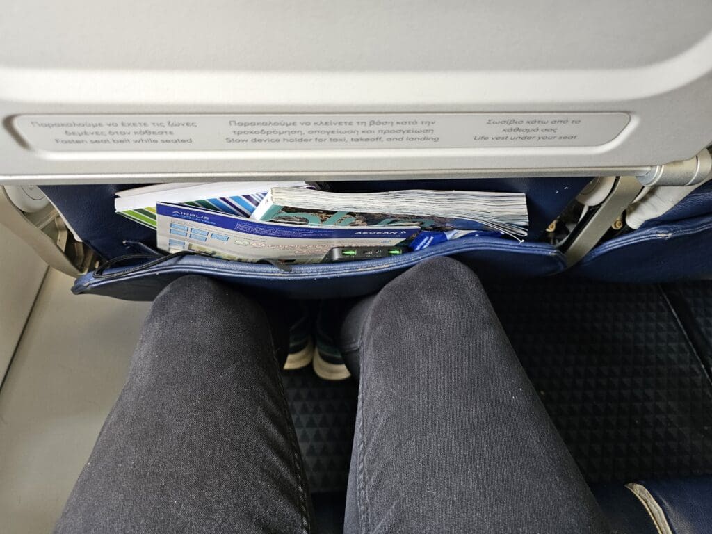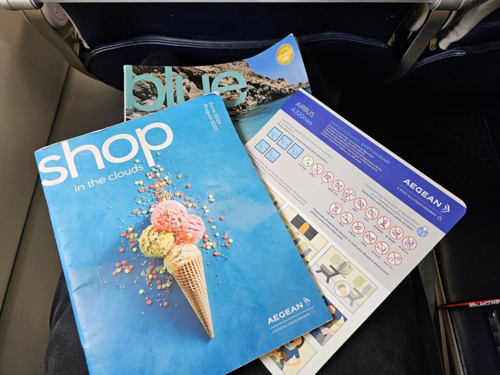 Not wishing to spend any more time than necessary in the lavatory, I soon returned to my seat and settled in for the journey ahead. Unfortunately, upon sitting down, I was once again disappointed. Examining the area around my seat, this appeared to be highly battered and tired-looking and featured plenty of well-ingrained dirt plus a reasonable amount of rubbish from the inbound flight. Examining the contents of the seatback pocket, this contained nothing other than a copy of Aegean Airlines’ onboard shopping catalogue and a sick bag. Finally, I found the seat to be relatively cramped and offered a poor amount of legroom, seemingly worse than their Airbus A320ceos that I had previously sampled. Overall, given Aegean Airlines’ stellar reputation and my previous experience with the carrier, despite the friendly welcomes from the crew, the cramped, dirty and battered cabin got things off to a poor start, and I sincerely hoped that things would improve during the flight!