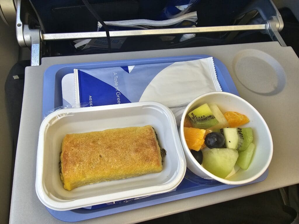 Around half an hour after the lunch service commenced, a flight attendant politely asked whether I would like a spinach pie or cheese pie. Opting for the former, a dish containing this was soon plonked down on a small plastic tray and cautiously passed over to me. A short time later, the second trolley arrived and an equally polite and friendly flight attendant requested my drinks choice – whilst in the holiday spirit, I decided to opt for a plain and simple orange juice rather than the complimentary alcohol that many of my fellow passengers seemed to be indulging in. Without delay, I soon got to work examining the contents of the lunch, although admittedly this did not take long and consisted of a small spinach pie and a fruit salad along with a sachet containing wooden cutlery, serviettes and a wet wipe. Whilst the portion size was perhaps not as plentiful as I have seen offered on some other Aegean Airlines services, all-in-all this proved to be a decent offering and I ended up being rather pleased with the deliciousness of the pie, the friendliness of the crew during this service this and the use of sustainable packaging and cutlery. Meanwhile, the crew commenced their rubbish collection service a reasonable amount of time after all meals had been distributed.