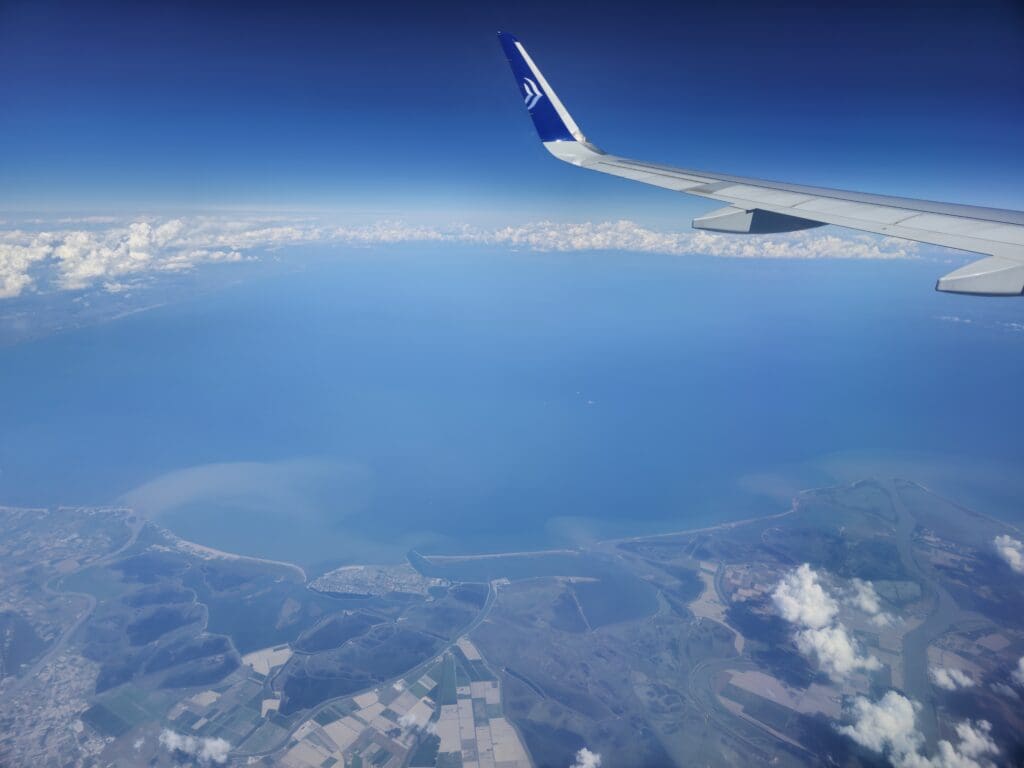 As I nibbled on the pie, I admired the tall snowy peaks outside before these rose downwards as we headed south over the Italian region of Veneto. Not too long after this, the waters of the Adriatic Sea appeared as we passed to the west of Venice before we crossed the sandy coastline near the Parco del Delta del Po. From there, relatively little could be seen other than the blue waters below and the occasionally passing ship although eventually a cluster of Croatian islands appeared in the distance – the nearest and most visible of which took the form of Vis.
