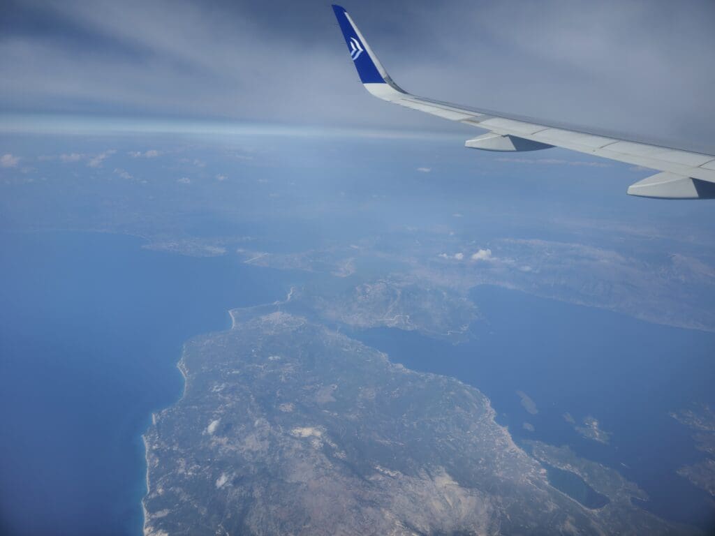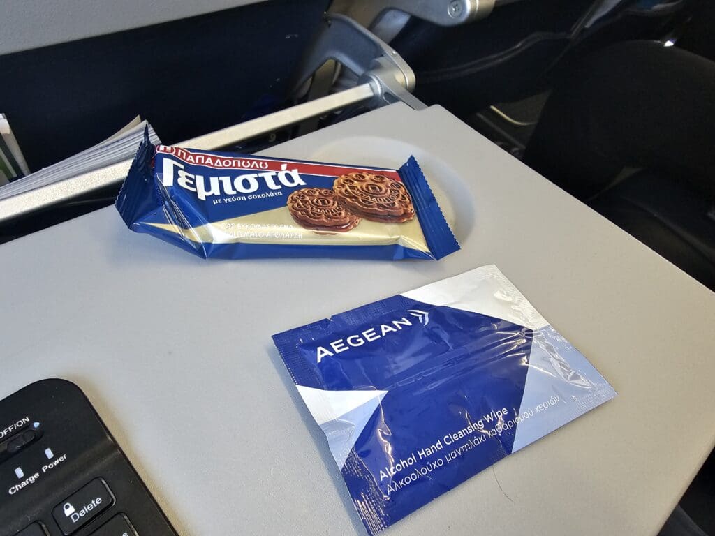 Once I had returned to my seat, the Greek island of Corfu could already be seen outside, indicating that we were nearing the end of the journey. Thankfully, I had made it back to my seat just in time for the pre-arrival snack service and was soon handed a pack of Papadopoulos chocolate biscuits by one of the friendly flight attendants. Whilst not failing to take the edge of the more negative aspects of my flight, this was positively unexpected and a nice way to round off the flight. As I nibbled these, the island of Lefkada could be seen below at which point the aircraft could be felt commencing its descent.