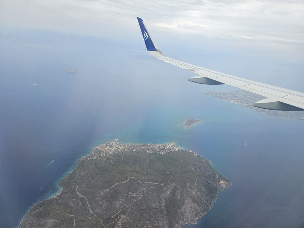 With plenty of dark and stormy clouds lingering around, the seatbelt signs were illuminated immediately after the Airbus had commenced its descent and soon the crew passed through the cabin collecting rubbish and ensuring that all was secure and in place for our arrival into Athens. Thanks to the clouds, at this time only patches of Greece could be seen as we passed the city of Patras and descended over the hills and mountains of the Peloponnese peninsula. Just before reaching Nafplion, the aircraft sank below the clouds for good and headed out over the blue waters of the Saronic Gulf. Soon, the small islands of Agistri and Egina came into view as we passed these and made our way towards the mainland’s coastline.