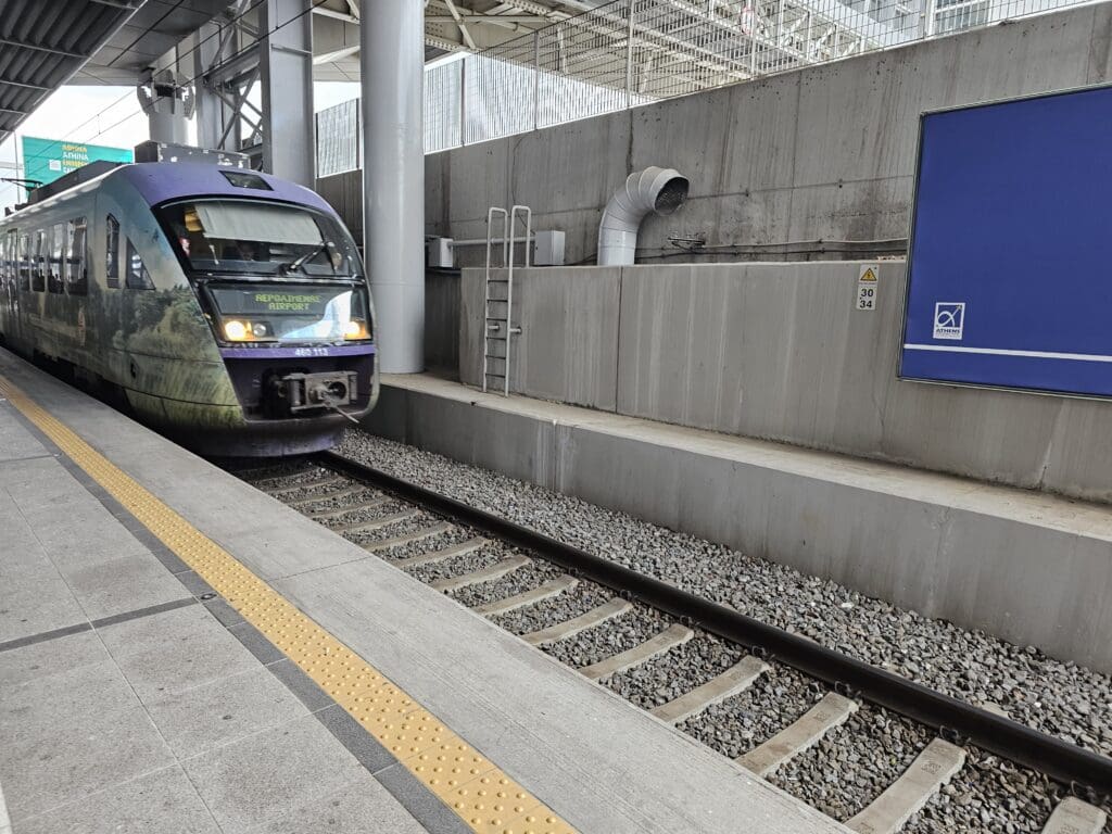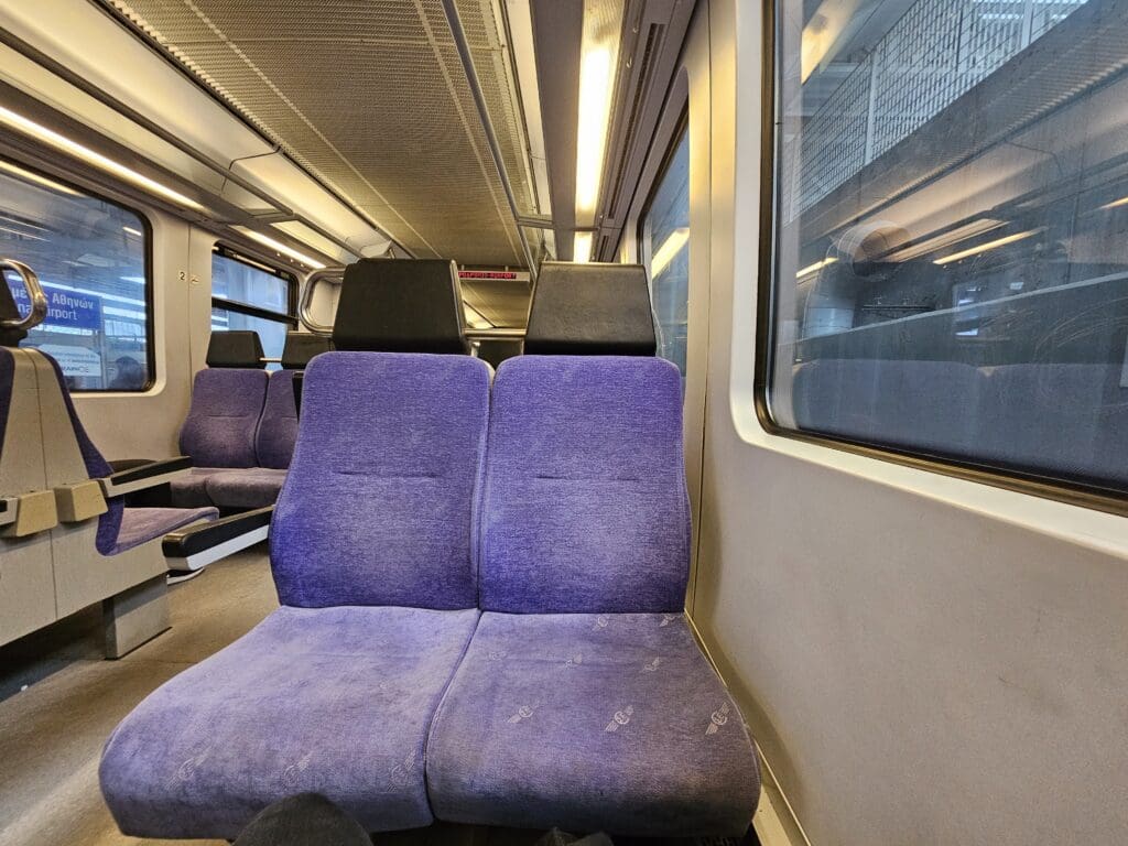 Outside, steps were soon wheeled up to the front and rear doors, and two buses could be seen waiting to shuttle passengers to the terminal building. At 1728, six minutes after the Airbus had come to a halt, disembarkation commenced, and I soon stood up, collected my bag and made my way rearward,s where I was thanked in a pleasant and friendly manner before heading out into the afternoon Greek heat. Soon making it onto the bus, once this was full, the doors slid closed and we began our short journey over to the main terminal. Deposited near the entrance to the immigration hall, thankfully most desks were open and just a short and fast-moving queue could be seen leading up to these. After no more than three minutes of waiting in line, a rather disinterested immigration officer took my passport, continuing their conversation with their colleague on the other half of the booth as they scanned and stamped it. Once this had been handed back to me, I continued onwards, speeding through the baggage collection hall before making my way to the airport’s dedicated metro and suburban railway station for my journey into Athens.