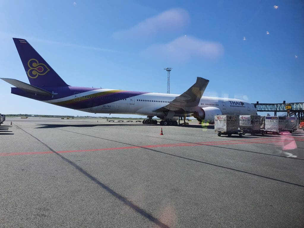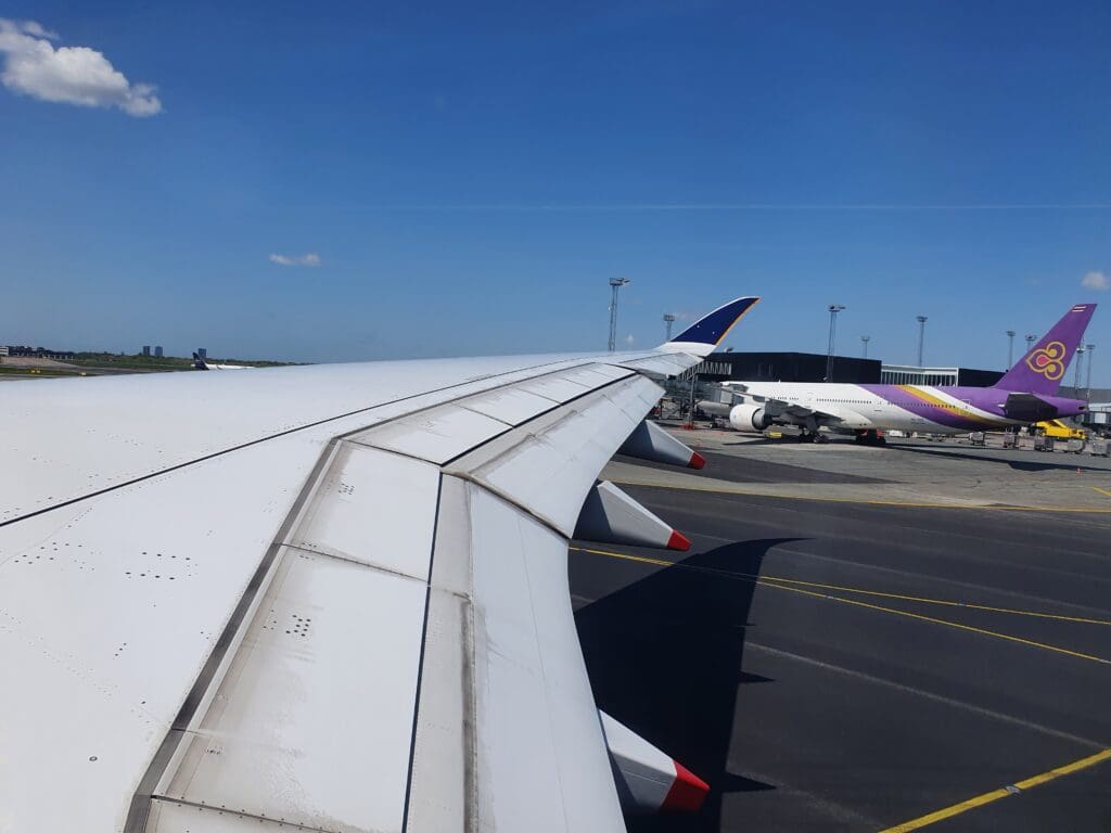 At 1110, an announcement was made in Danish and English inviting all those bound for Rome to head forward for boarding at which point a crowd of disgruntled and weary-looking passengers formed. Conveniently yet inadvertently ending up near the front of this crowd, it didn’t take long before I scanned my boarding pass and made my way out to the first of two waiting buses that would shuttle passengers out to the Airbus A350. Once comfortably full, at 1116 the bus doors slid closed and the Cobus pulled away, commencing its short journey over to the aircraft. This took us past a Scandinavian Airlines Airbus A330-300 being readied for its flight to Newark before voyaging across the apron towards that morning’s two visitors from Southeast Asia – the Singaporean Airbus at Stand C37 and a colourful Thai Airways Boeing 777-300ER at the neighbouring gate.