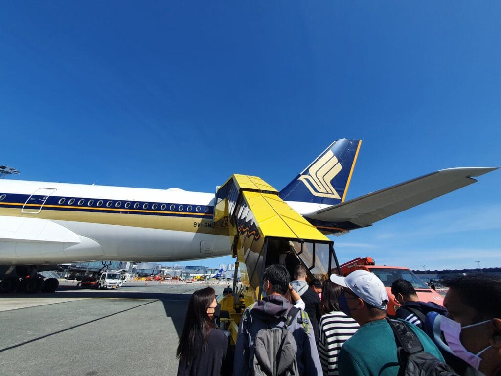 Moments after coming to a halt, the bus doors slid open and passengers spilt out onto the apron. Whilst a jet bridge was connected to the aircraft and enabled passengers to disembark into the non-Schengen portion of the terminal, this was not used for boarding. Instead, all passengers were required to board the aircraft via a long set of airstairs positioned up the Airbus’ rear door. After admiring the large widebody jet standing in front of me, I made my way towards the stairs and queued on these for a couple of minutes or so before eventually reaching the door at the rear of the aircraft.