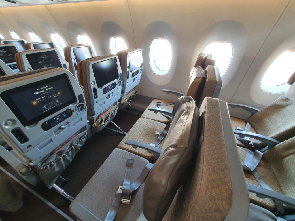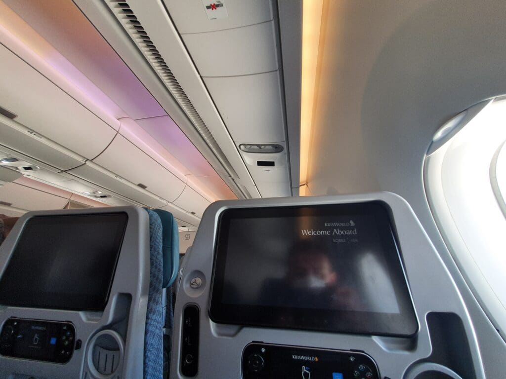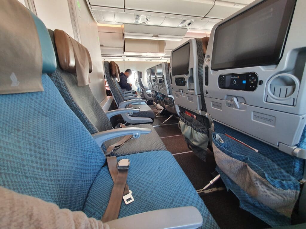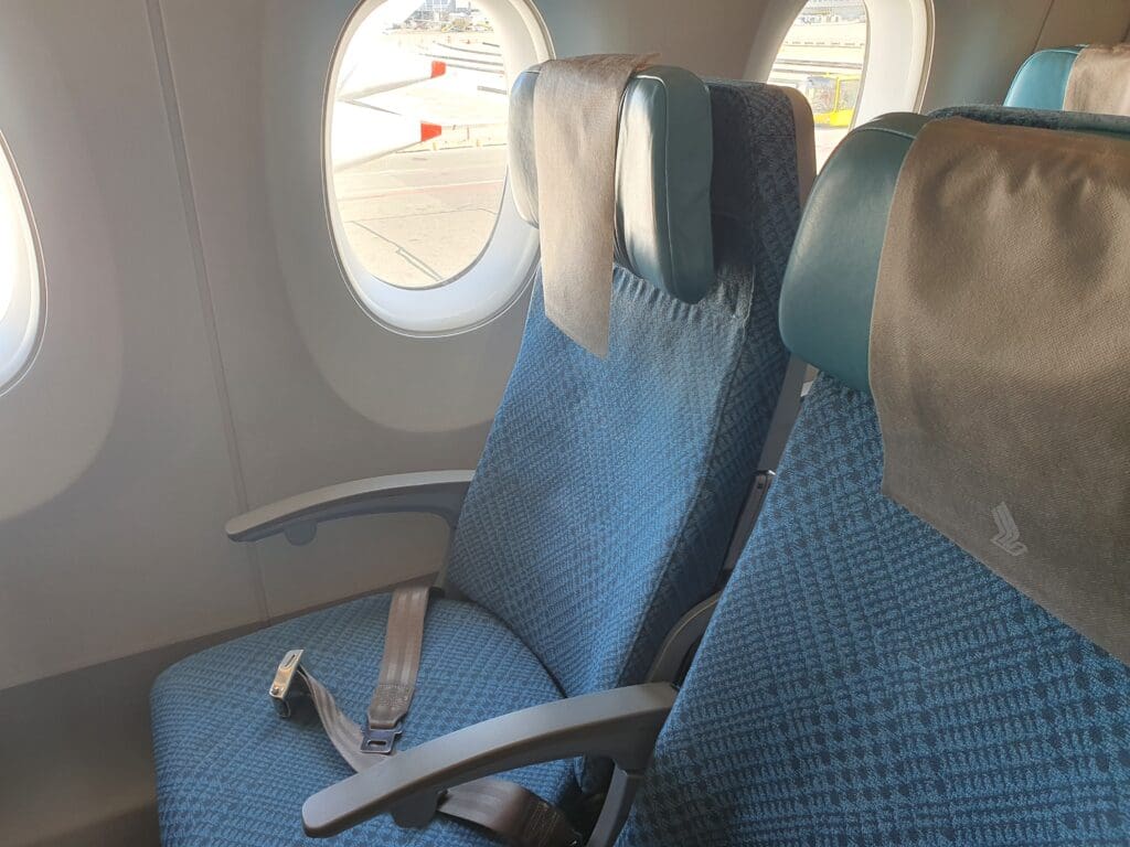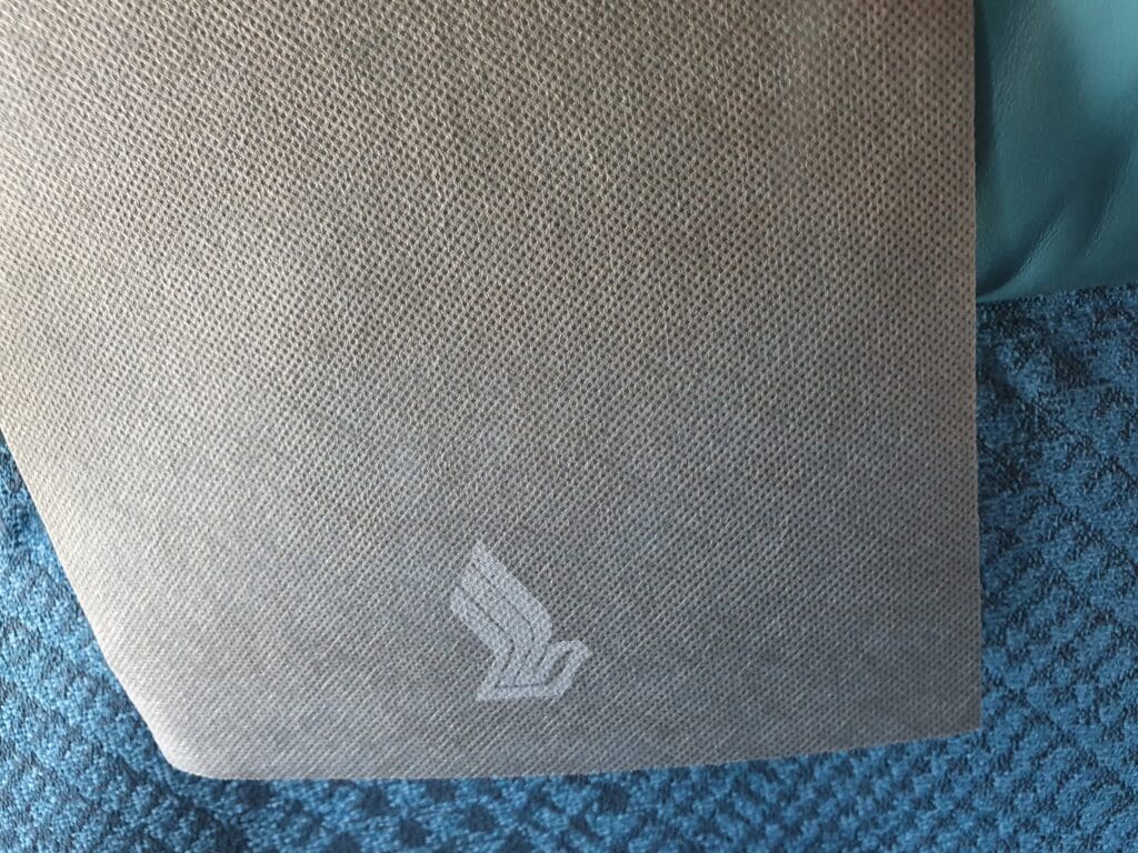 As soon as I stepped into the large galley at the rear of the aircraft, two flight attendants sporting Singapore Airlines’ famous colourful kebayas rushed to give me a friendly welcome, with one checking my boarding pass and advising me on how to reach my seat before the other handed me a packet containing earphones. As I crossed the galley and turned left, I received yet another warm and friendly greeting just before entering the larger of the aircraft’s two Economy cabins. Singapore Airlines operates three different variants of their Airbus A350-900s – their premium ultra-long haul variant used on their services between New York and Singapore, a regional variant that operates short and medium-haul services and lacks a Premium Economy cabin, and the standard long haul variant which is complete with three different cabins – Business, Premium Economy and Economy. Flying on the lattermost variant, the aircraft featured a total of 187 Recaro CL3710 seats in Economy, with these spread across two cabins, equating to around 74% of the seats onboard. Whilst not as pronounced as onboard MIAT Mongolian’s Boeing 767-300ER, those seats in the two Economy cabins are slightly different in their aesthetic design, with those in the forward cabin covered in either blue or grey fabric, whilst those in the rear cabin are covered in either beige or brown. However, all of these featured the same subtle repeating pattern and were topped with a comfortable (faux?) leather adjustable headrest, covered by a dark grey disposable fabric antimacassar on which the airline’s iconic Kris motif could be seen.