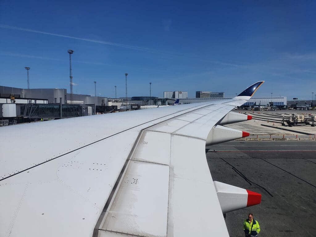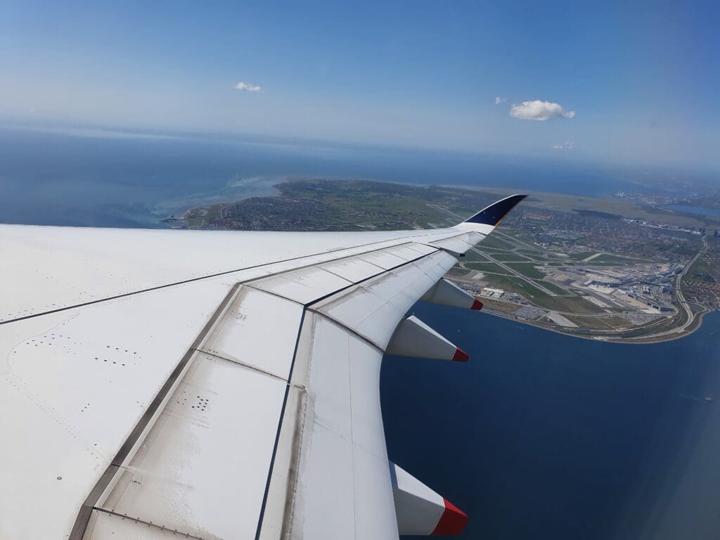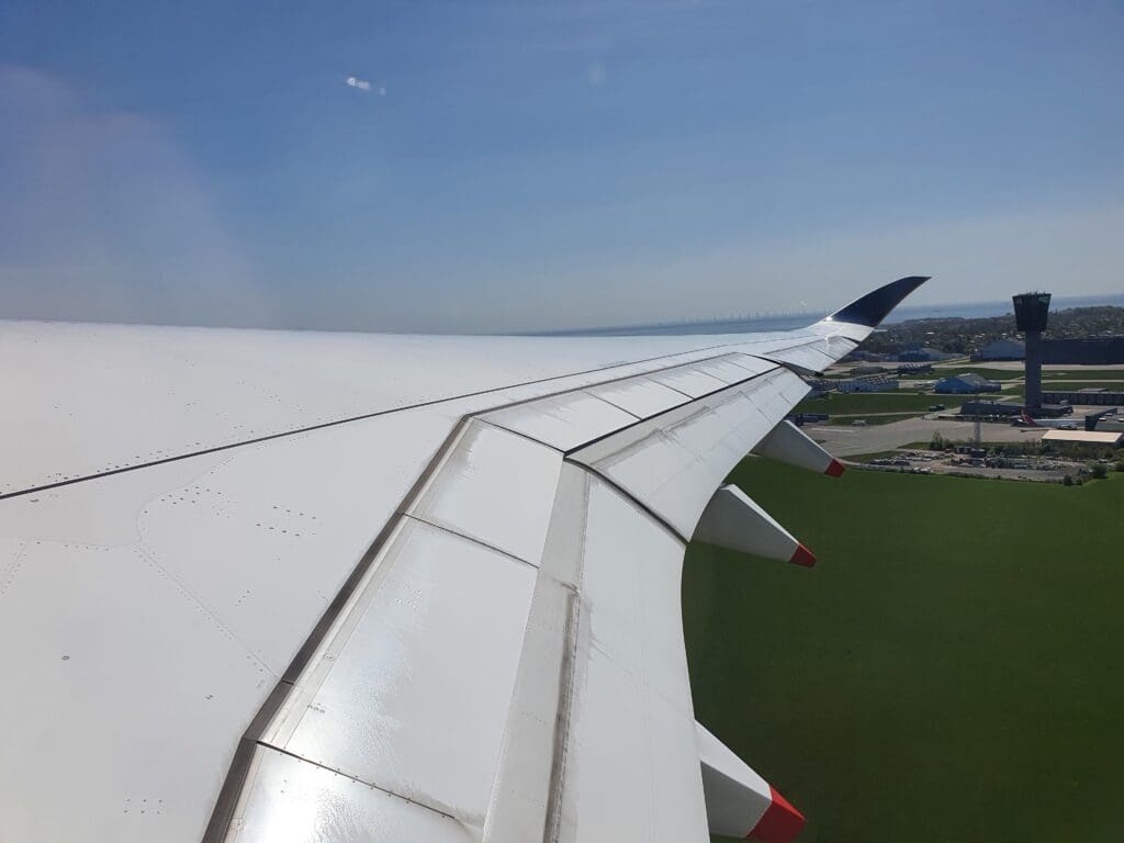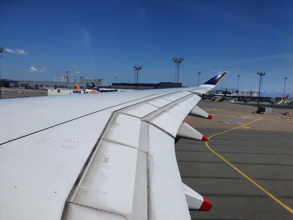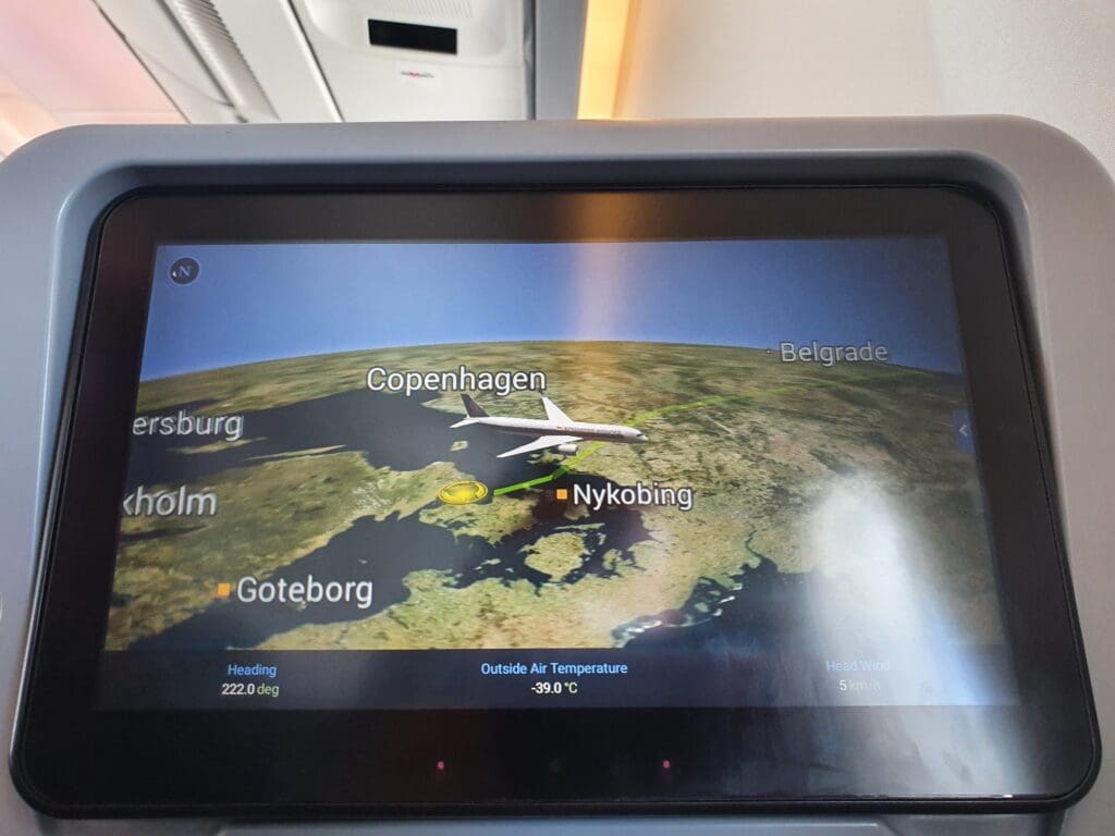 Once the safety video and demonstration had come to an end, the cabin crew then passed through the cabin ensuring that everything was secure and in place for our departure. During this, I noticed that rather than haphazardly rushing through the cabin as is sometimes the case, the flight attendants took their time to ensure that absolutely nothing had been missed and it seemed that everything was double and then triple-checked by other flight attendants. A short time later, the Airbus was gently pushed back from its stand, travelling quite some distance before coming to a halt near the end of Copenhagen Airport’s F pier. Whilst by this time most passengers perhaps wanted to get away as soon as possible, after the Airbus came to a halt the Captain performed another announcement informing all passengers that there would be a five-minute wait until we could start up our engines and that we could expect to be in the skies by 1210. Whilst some passengers, particularly those deeply engrossed in the inflight entertainment system may have been slightly annoyed at the Captain’s very regular announcements, I was left rather impressed as it seemed that the Captain clearly recognised the failings in passengers’ experience on the ground in Copenhagen and wished to be open and honest with passengers, keeping them as up-to-date and informed as possible. As we waited, a loud whining motor noise and several clunks could be heard coming from below – with this being the first time that I have ever heard such sounds onboard an Airbus A350!
