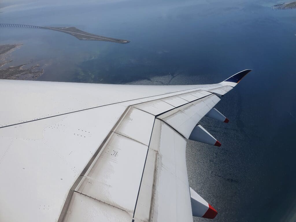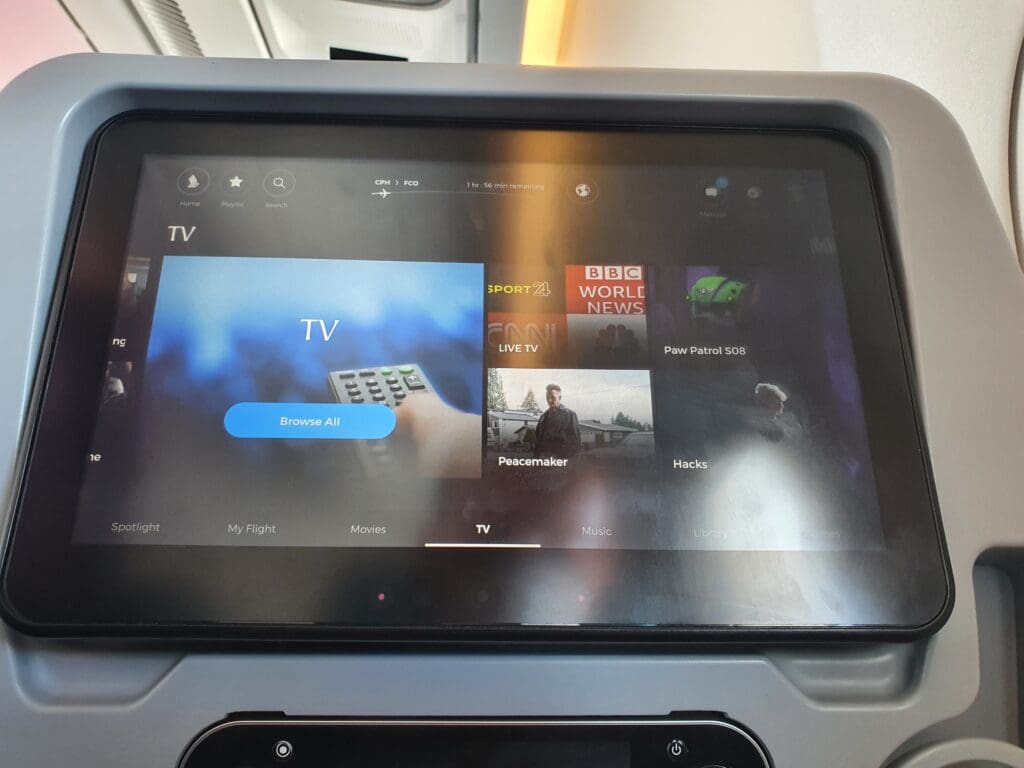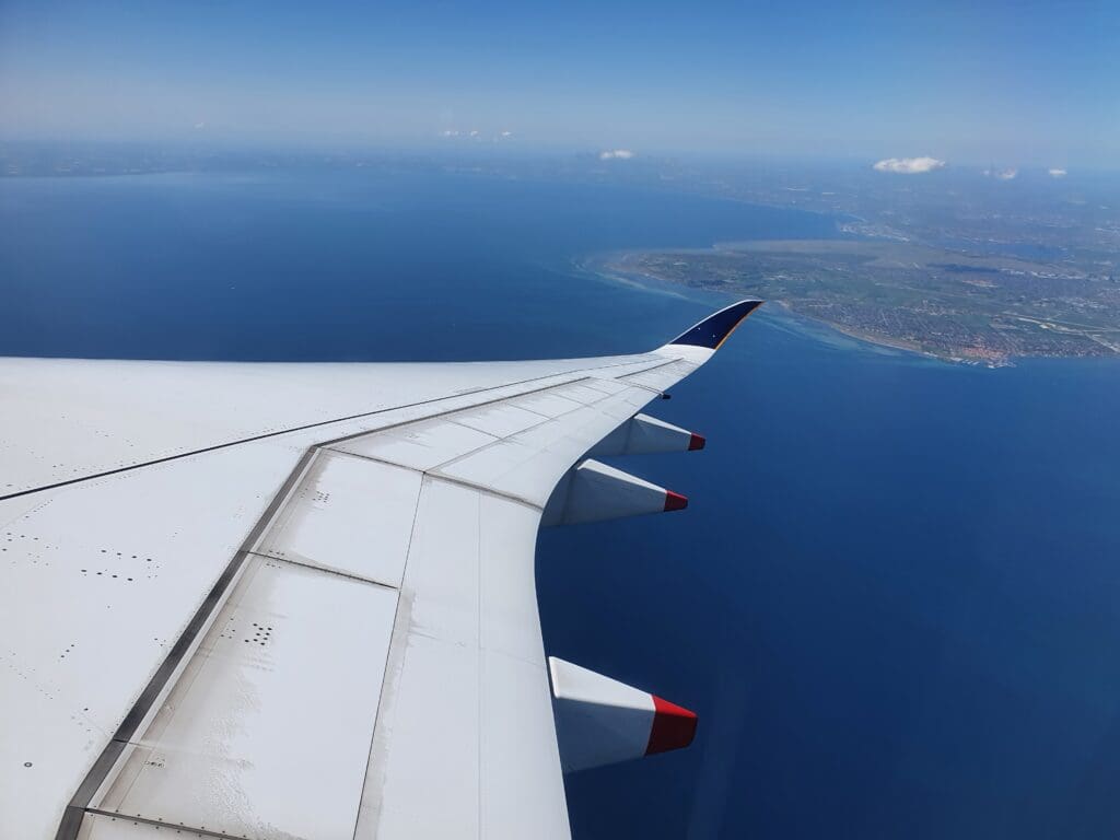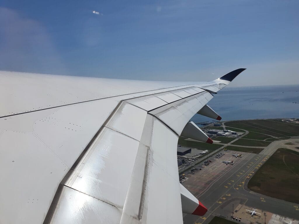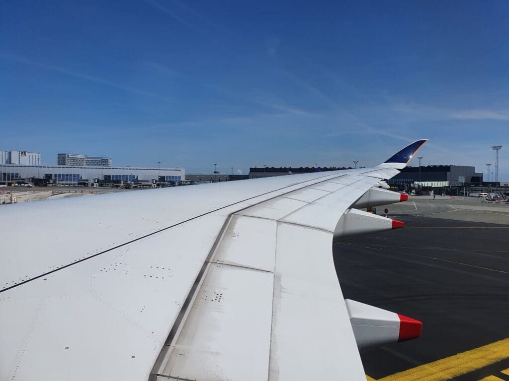 Once the safety video and demonstration had come to an end, the cabin crew then passed through the cabin ensuring that everything was secure and in place for our departure. During this, I noticed that rather than haphazardly rushing through the cabin as is sometimes the case, the flight attendants took their time to ensure that absolutely nothing had been missed and it seemed that everything was double and then triple-checked by other flight attendants. A short time later, the Airbus was gently pushed back from its stand, travelling quite some distance before coming to a halt near the end of Copenhagen Airport’s F pier. Whilst by this time most passengers perhaps wanted to get away as soon as possible, after the Airbus came to a halt the Captain performed another announcement informing all passengers that there would be a five-minute wait until we could start up our engines and that we could expect to be in the skies by 1210. Whilst some passengers, particularly those deeply engrossed in the inflight entertainment system may have been slightly annoyed at the Captain’s very regular announcements, I was left rather impressed as it seemed that the Captain clearly recognised the failings in passengers’ experience on the ground in Copenhagen and wished to be open and honest with passengers, keeping them as up-to-date and informed as possible. As we waited, a loud whining motor noise and several clunks could be heard coming from below – with this being the first time that I have ever heard such sounds onboard an Airbus A350!