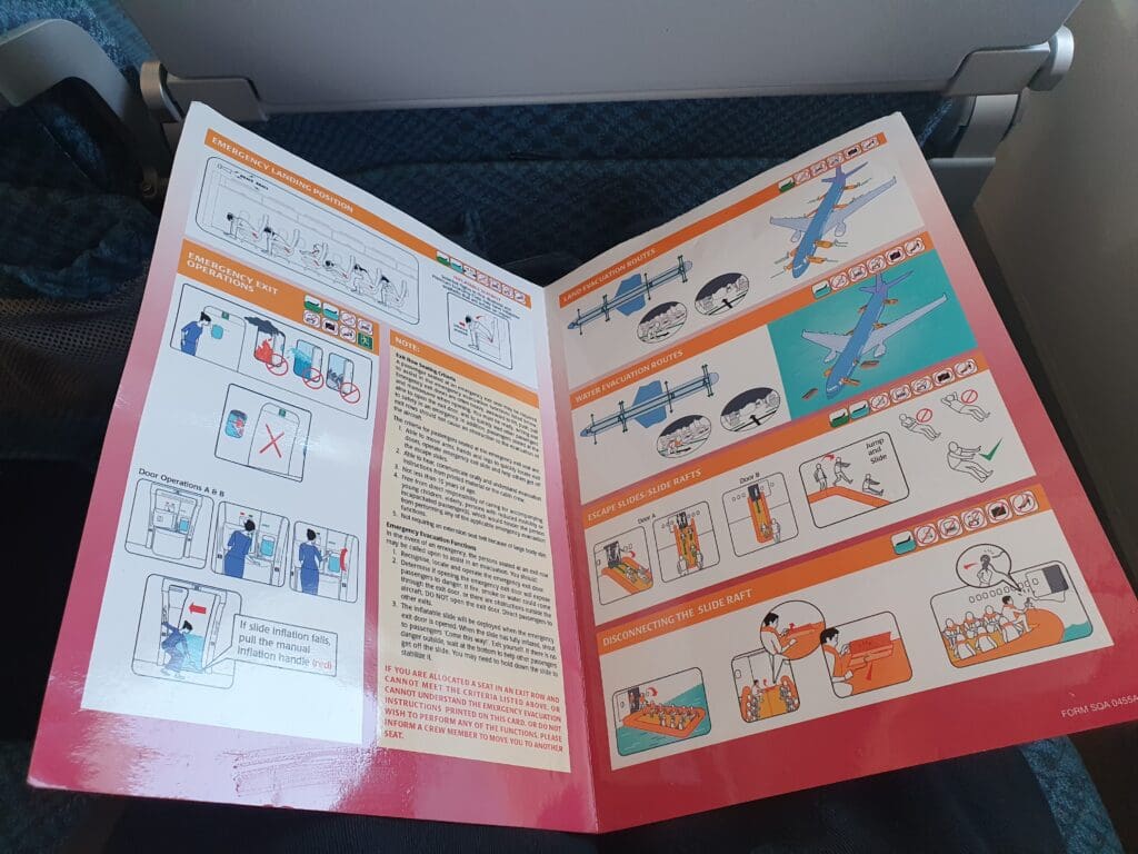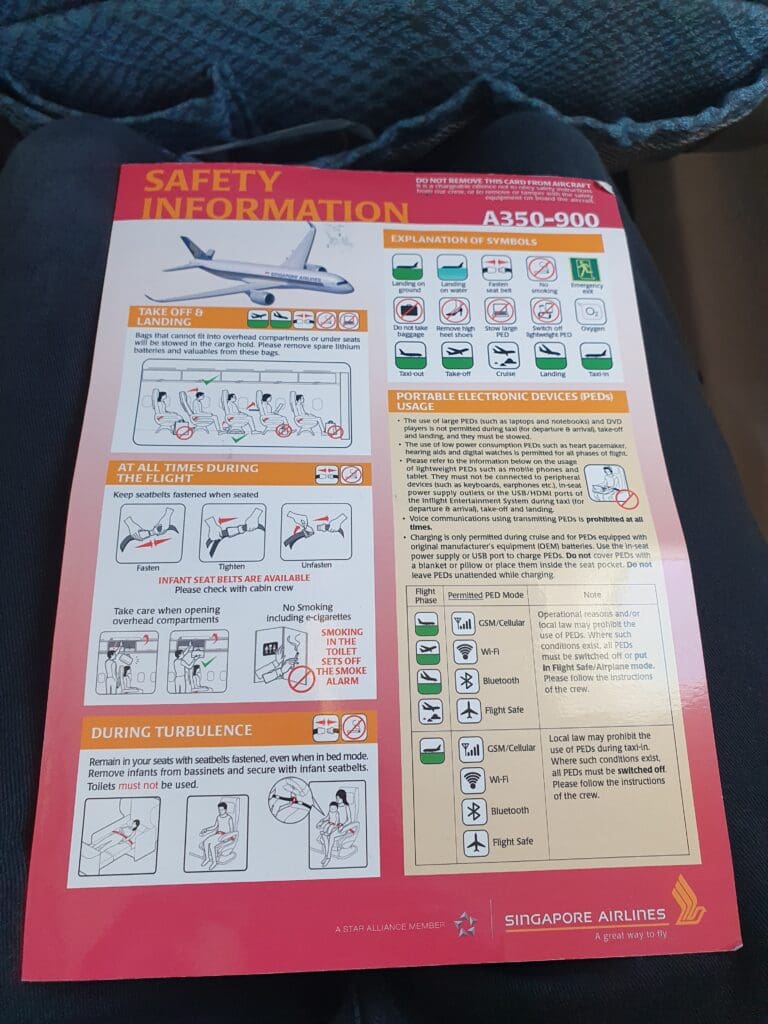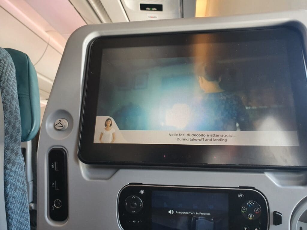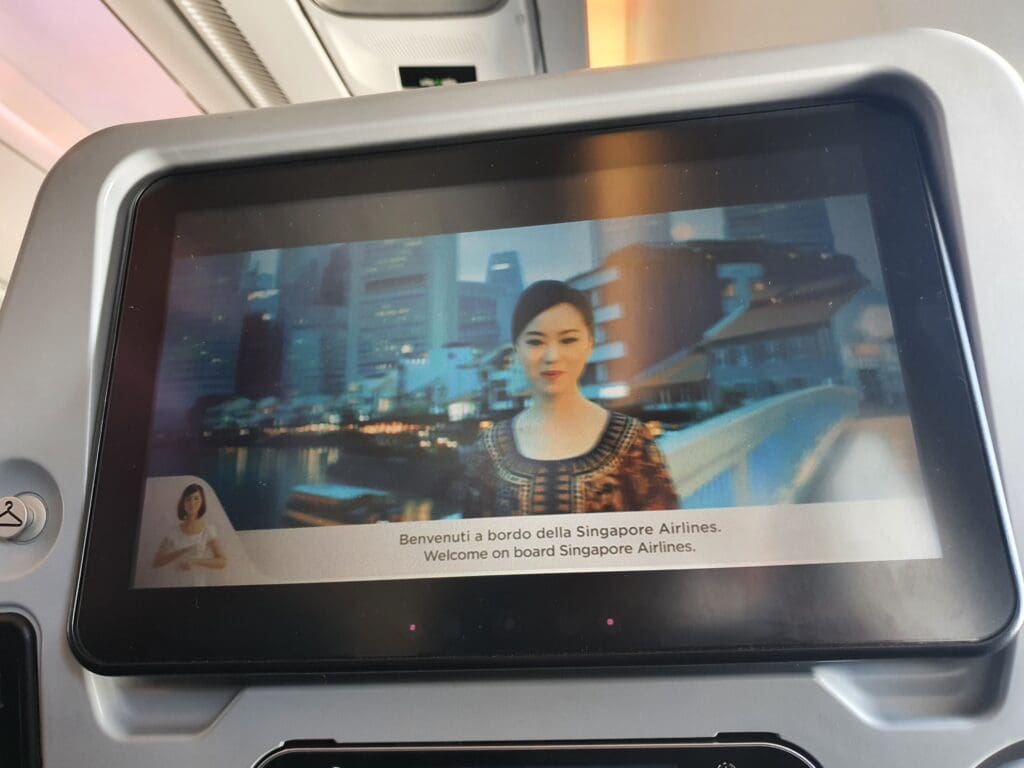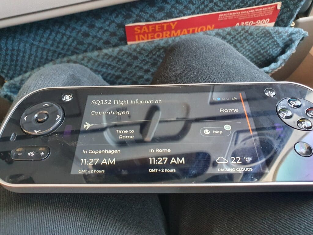 Once the doors had been closed, Captain Sebastian’s reassuringly calm tones filled the cabin as they commenced their long welcome announcement. This started with an apology for the long delay in Copenhagen, and for the fact that passengers had been provided with absolutely no information regarding this during their wait in the terminal – promising that this would be investigated. The Captain then went on to explain that this delay had been caused by a technical problem with the Airbus’ flight control system which needed to be looked at whilst on the ground. Fortunately, whatever this issue had been, this did not prove serious enough to warrant grounding the aircraft, and having faith in the technical abilities of the local Airbus A350 specialists, I was not too concerned by this. Following this apology and explanation for the delay, the Captain went over the usual details – briefing us on the weather both during the flight and on the ground in Rome, noting our flight time of 2H05 and informing passengers that we could follow the flight’s progress on the inflight entertainment system. Once the Captain’s announcement came to an end, there was a brief pause before the Purser performed a slightly robotic announcement with the usual welcomes and warnings, as well as some brief safety instructions which was then followed up in more detail by Singapore Airlines’ long safety video. Introduced in 2017, Singapore Airlines’ safety video takes passengers on a journey through some of Singapore’s most famous sites, and on that particular flight was accompanied by English and Italian subtitles. Keeping us as up-to-date as possible, as the safety video neared its end this was momentarily interrupted when the Captain performed a quick announcement informing us that we could expect to receive permission to leave our stand in the next ten minutes.