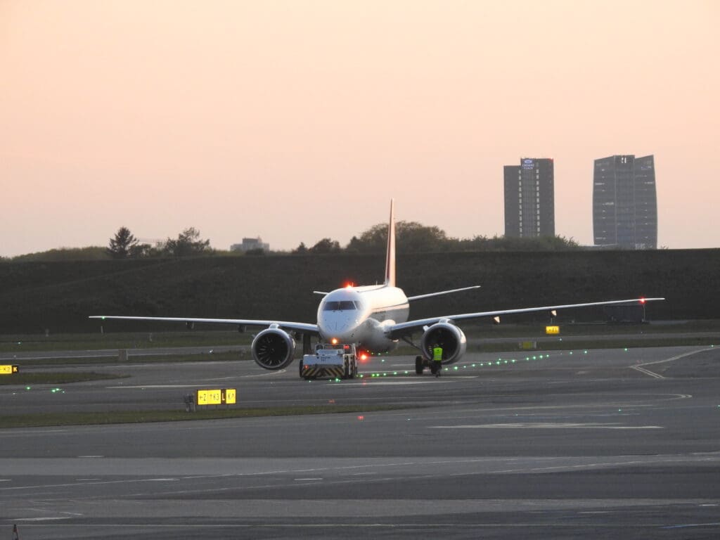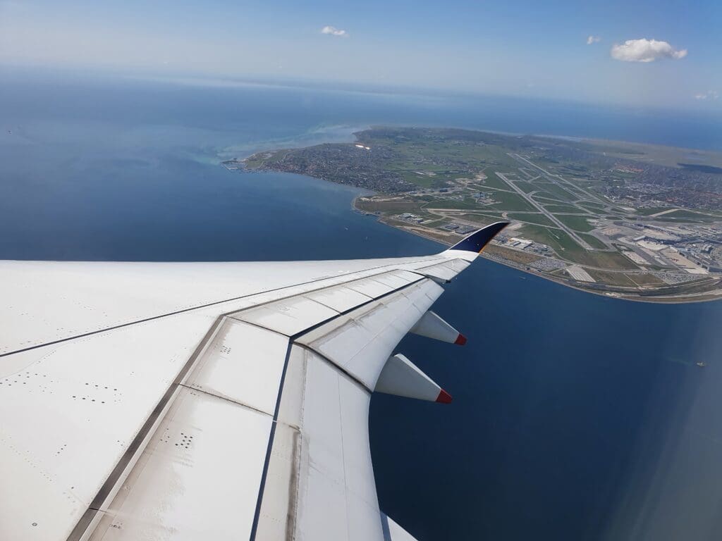 At 1157, the usual crescendo of humming and whirring could be heard, accompanied by a fair amount of vibration as the Airbus’ two massive Rolls-Royce Trent XWB engines quietly powered up into life. Three minutes later, the Airbus taxied away from the apron under its own steam and commenced its journey towards the end of Runway 04R. At 1206, the Airbus arrived at the end of the runway and waited for a while before the cabin crew were requested to take their takeoff stations at 1209 just before the Airbus powered onto the runway. Without coming to a halt, once on the runway and lined up with the centreline, the two engines powered up and the Airbus commenced a powerful takeoff roll, rocketing down the runway and soon rotating upwards into the sunny Danish skies just before reaching Copenhagen Airport’s tall control tower. Within a second of taking to the skies, the waters of the Øresund appeared, whilst a cluster of hangars and airport-related buildings could be seen below, in the middle of which stood a lone Embraer 195 that once flew for the short-lived Danish carrier, Great Dane Airlines.