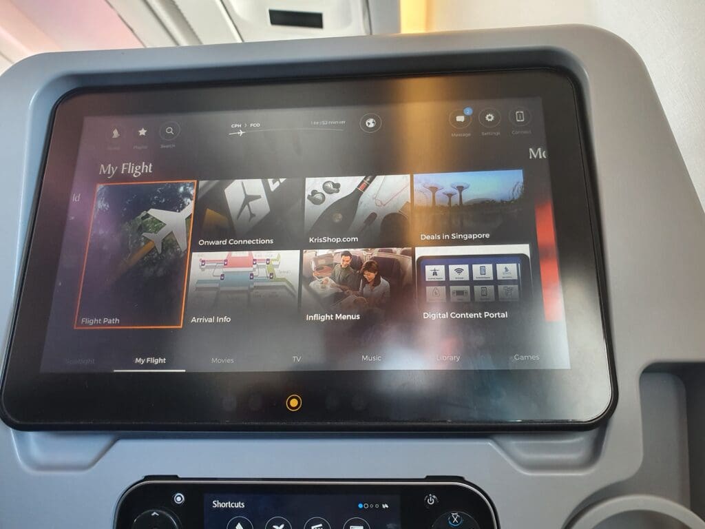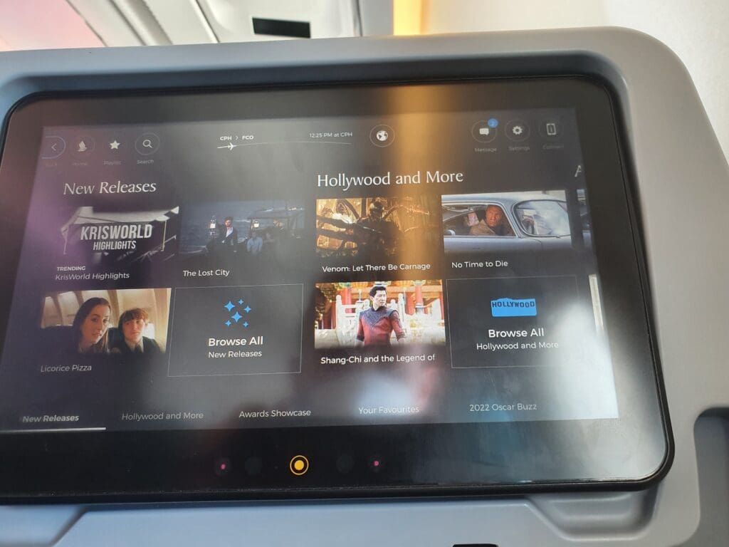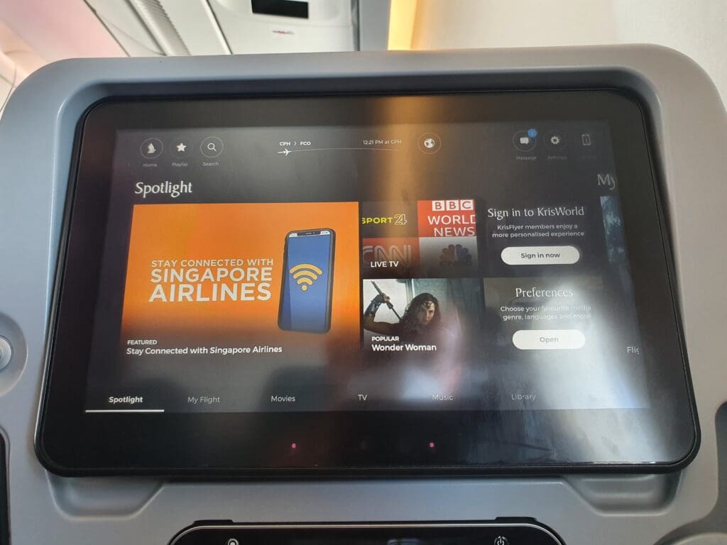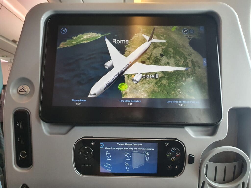 Considering Singapore Airlines’ stellar reputation and global route network which encompasses some of the world’s longest flights, many may not be surprised to hear that the carrier’s KrisWorld entertainment system is often heralded as being one of the best in the world. Whilst I would require little entertainment on the flight to Rome, I was nevertheless highly impressed by the breadth of content that the system offered. Those flying with Singapore Airlines can pass the time by watching hundreds of films and television programmes, and by listening to music albums from across the world. In addition, four live television channels are provided which allow passengers to keep up-to-date with the happenings in the world below – these being BBC World News, CNBC, CNNi and Sport 24. Aside from its fantastic array of content, I found the KrisWorld system to be well laid out, easy to use and available in ten different languages from across Singapore Airlines’ route network. In addition, many readers will likely be glad to hear that this system features an interactive Voyager 3D moving map which provides plenty of different options and settings for passengers to track the progress of their flight.