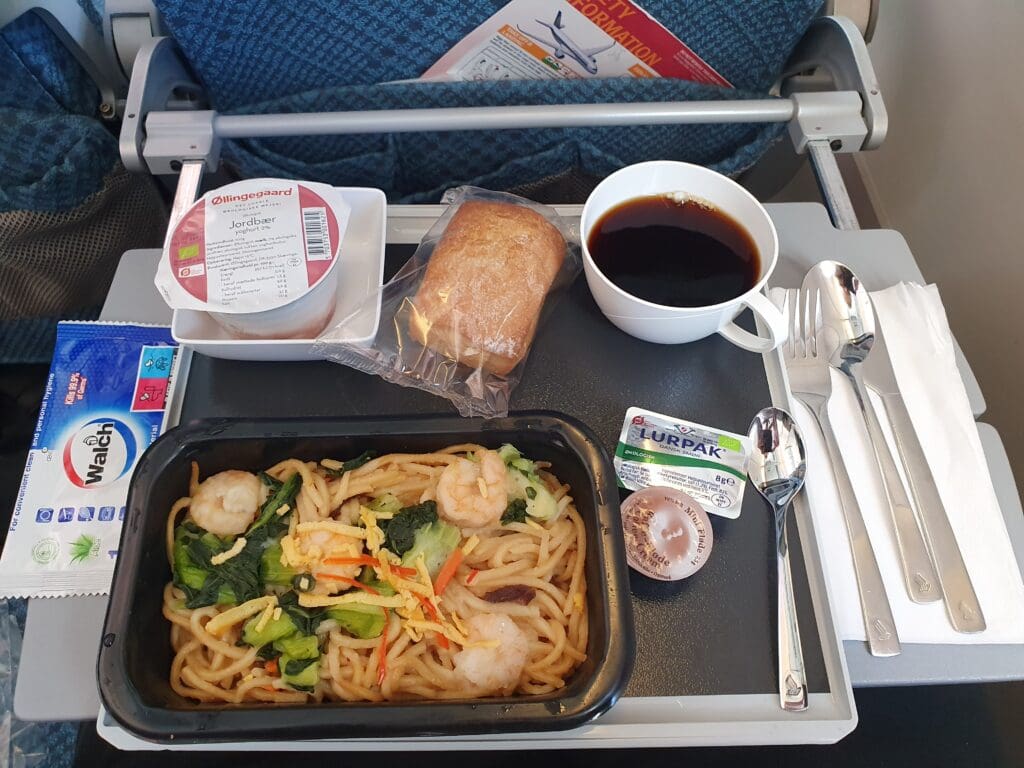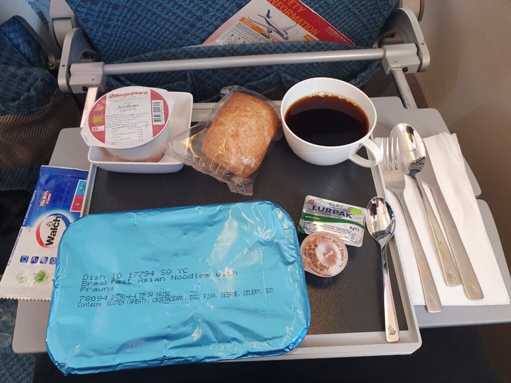 Upon lifting the lid of the main dish, I found this to be well presented and featured a decent number of prawns as well as a good selection of vegetables resting on a bed of noodles. Tucking into this without delay, I found this to taste as good as it looked and thus left me with no complaints at all. Soon polishing this hearty breakfast off, around twenty minutes after this had been handed to me, my empty tray was collected and I was offered a drink – with both alcoholic and non-alcoholic options available to passengers. Not fancying anything too strong, I opted for a still water plain and simple which was handed over to me in a Singapore Airlines branded plastic cup. Given the fact that complimentary hot meals in Economy are quite a rarity on short flights within Europe, I was left highly impressed by Singapore Airlines’ filling and delicious breakfast offering. This undoubtedly beats the buy-on-board offerings of the two other carriers that plough the route Copenhagen and Rome, Norwegian and Scandinavian Airlines.