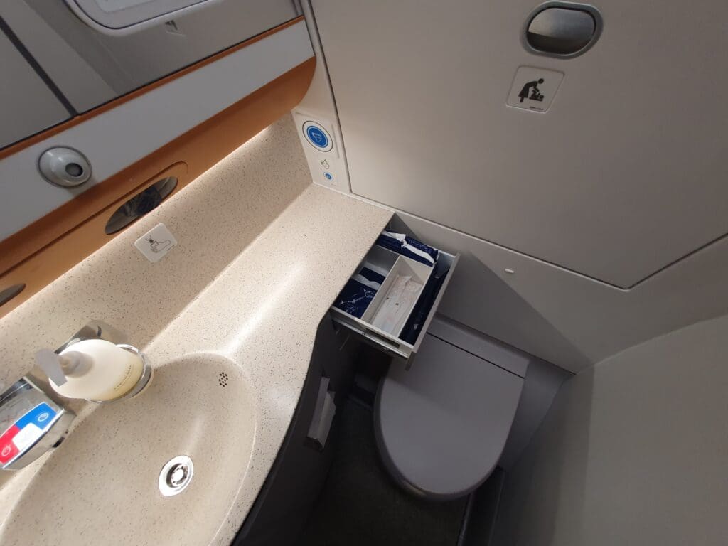 Recognising that there was not a great deal of the flight remaining, once in Italian airspace I decided to pay a trip to one of the lavatories located in between the forward and rear Economy cabins. Even though this appeared to have seen almost non-stop usage from the moment the seatbelt signs had been extinguished, I was delighted to see that this remained in a clean and pleasant state. However, I had noticed that flight attendants had checked this multiple times throughout the journey. Alongside the usual soap and tissues, a range of other items could be seen including paper cups, hand moisturising cream as well as packaged toothbrushes and sanitary kits located in a slide-out drawer. Left somewhat impressed by this offering, I returned to my seat and settled in for the final stages of the flight. By the time I had strapped myself in, the aircraft had crossed over into Italy’s Vicenza province and the first officer’s voice filled the cabin as they advised passengers that we were 250 miles to the north of Rome and that we would shortly commence our descent.