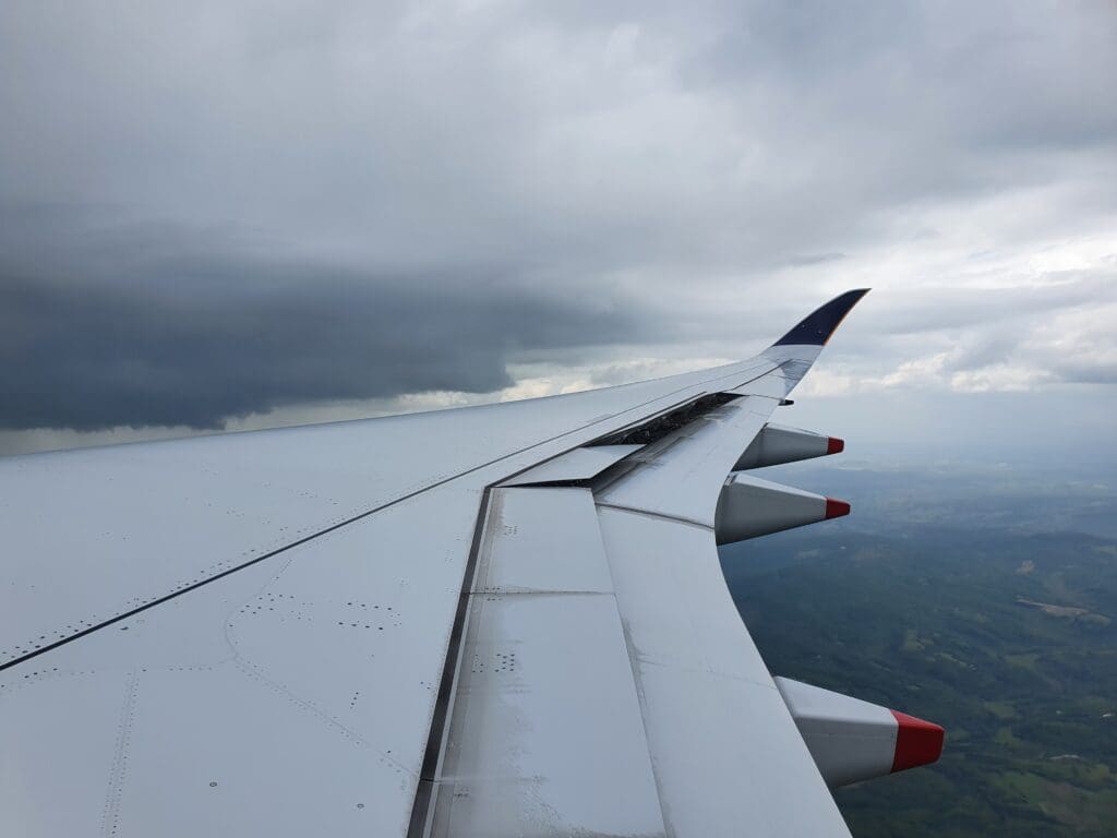 Once across the border from Vincenza to Forlì-Cesena, the Airbus could be felt commencing its long descent back to the ground. After passing through a thin layer of lingering high clouds, the Airbus’ speed brakes were partially extended and at 1355 the seatbelt signs were reilluminated just before we experienced some shaking and swaying as we passed through another layer of clouds. This was immediately followed by a pre-arrival announcement from the Purser before the army of cabin crew took to the aisles collecting any remaining rubbish and ensuring all was in position for our arrival. Unfortunately, as we descended, nothing of Italy could be seen below although dramatic storm clouds of varying shades of grey could be seen as we bumped around. Several minutes later, the Captain made an announcement advising passengers that we were on final approach and deviating around the weather to avoid the worst of the turbulence.